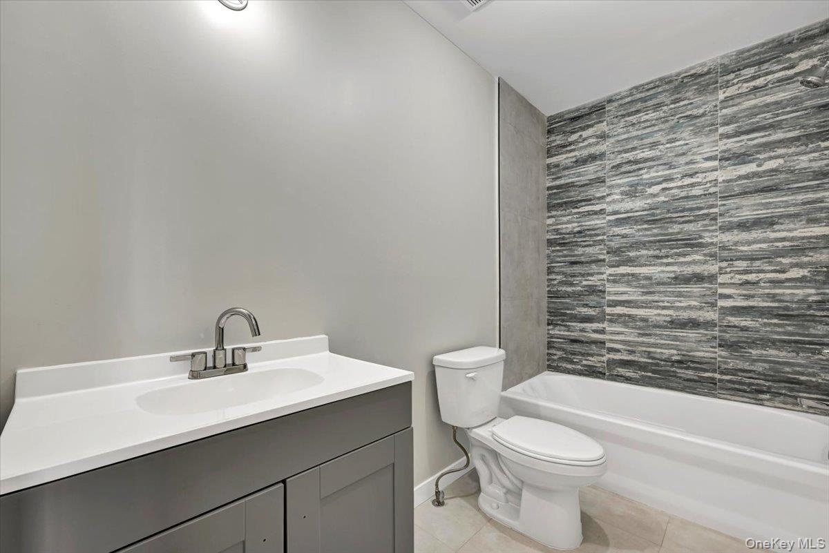 - Bathroom featuring tile patterned flooring, vanity, and tub / shower combination