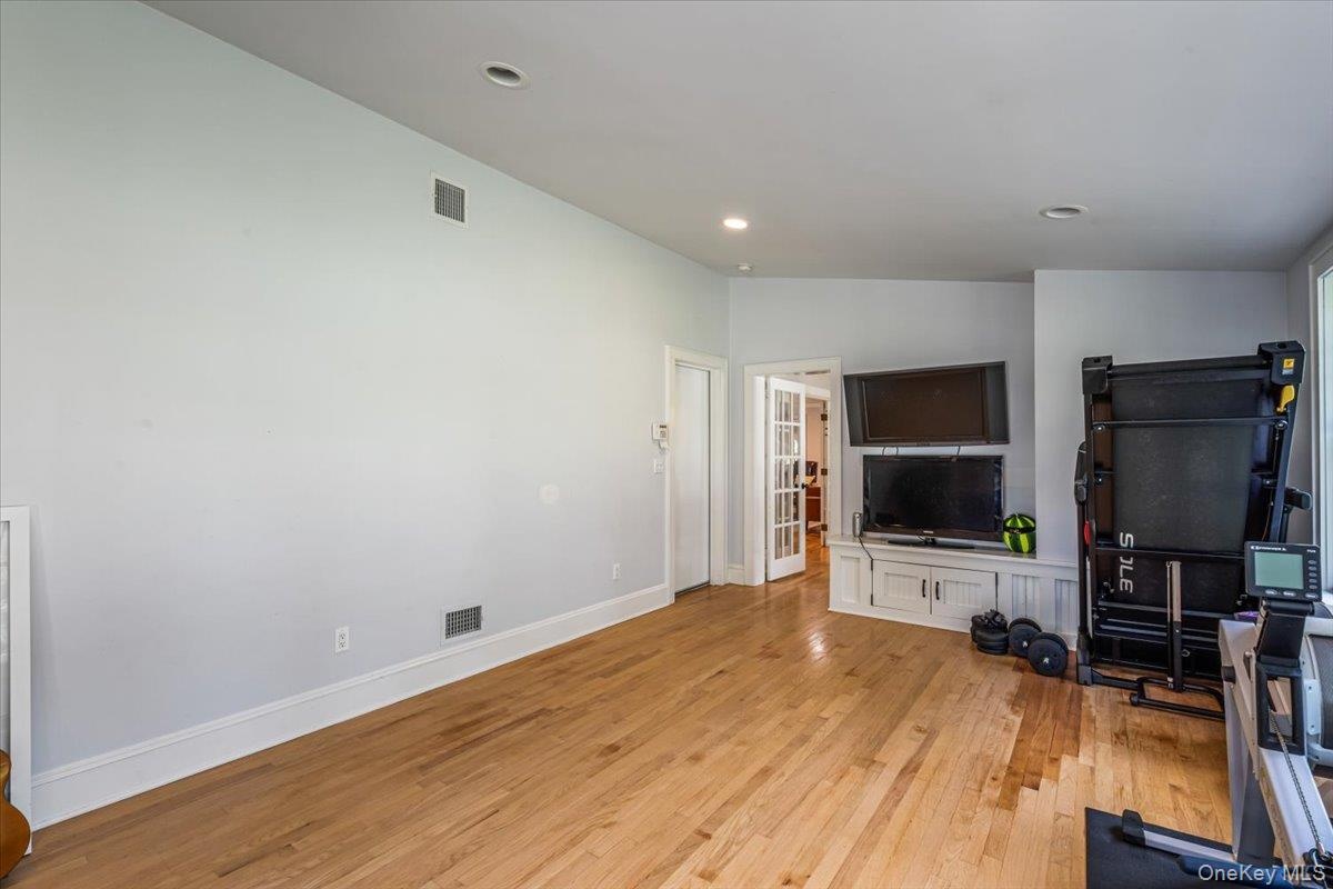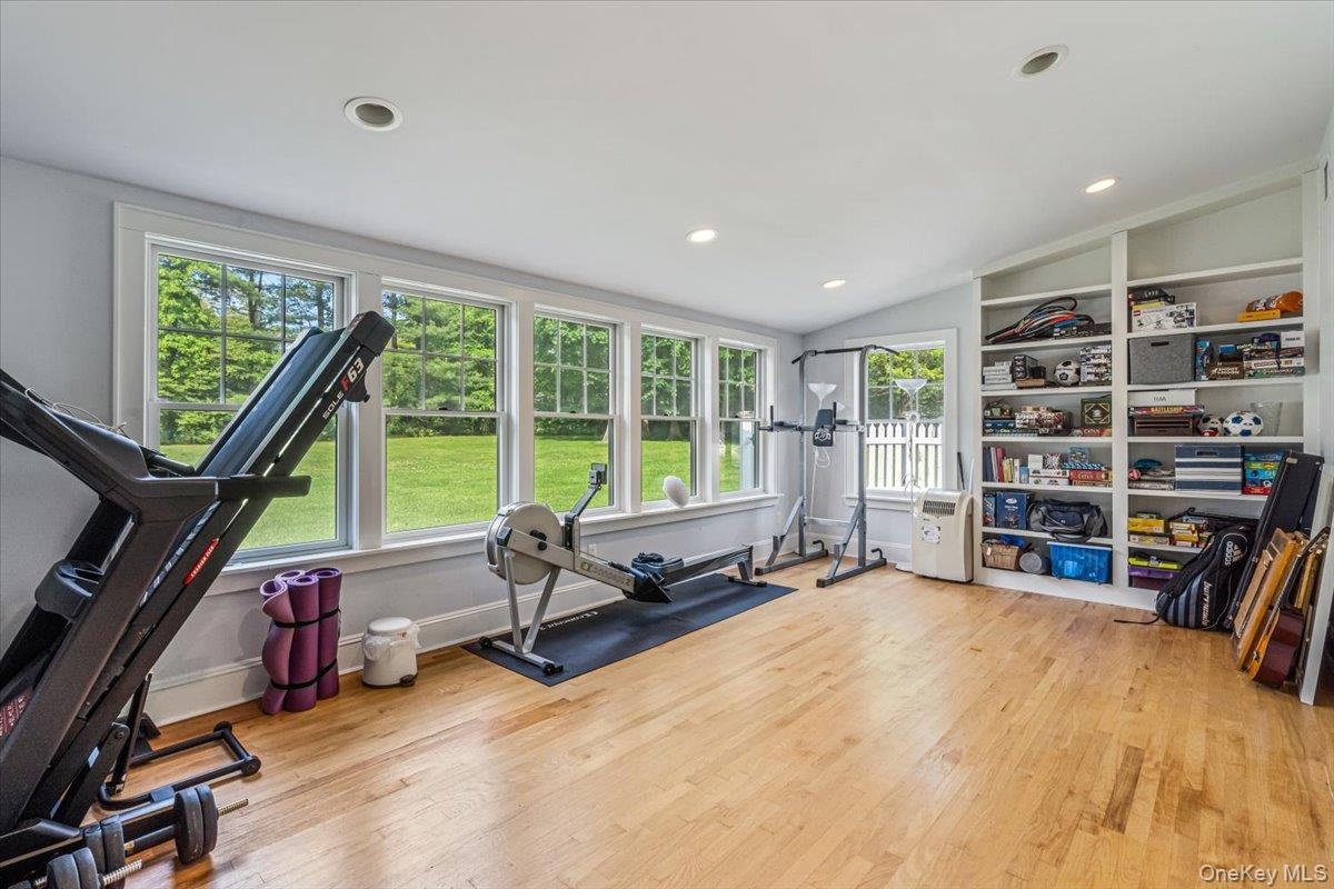 - Workout room with wood finished floors, vaulted ceiling, and recessed lighting