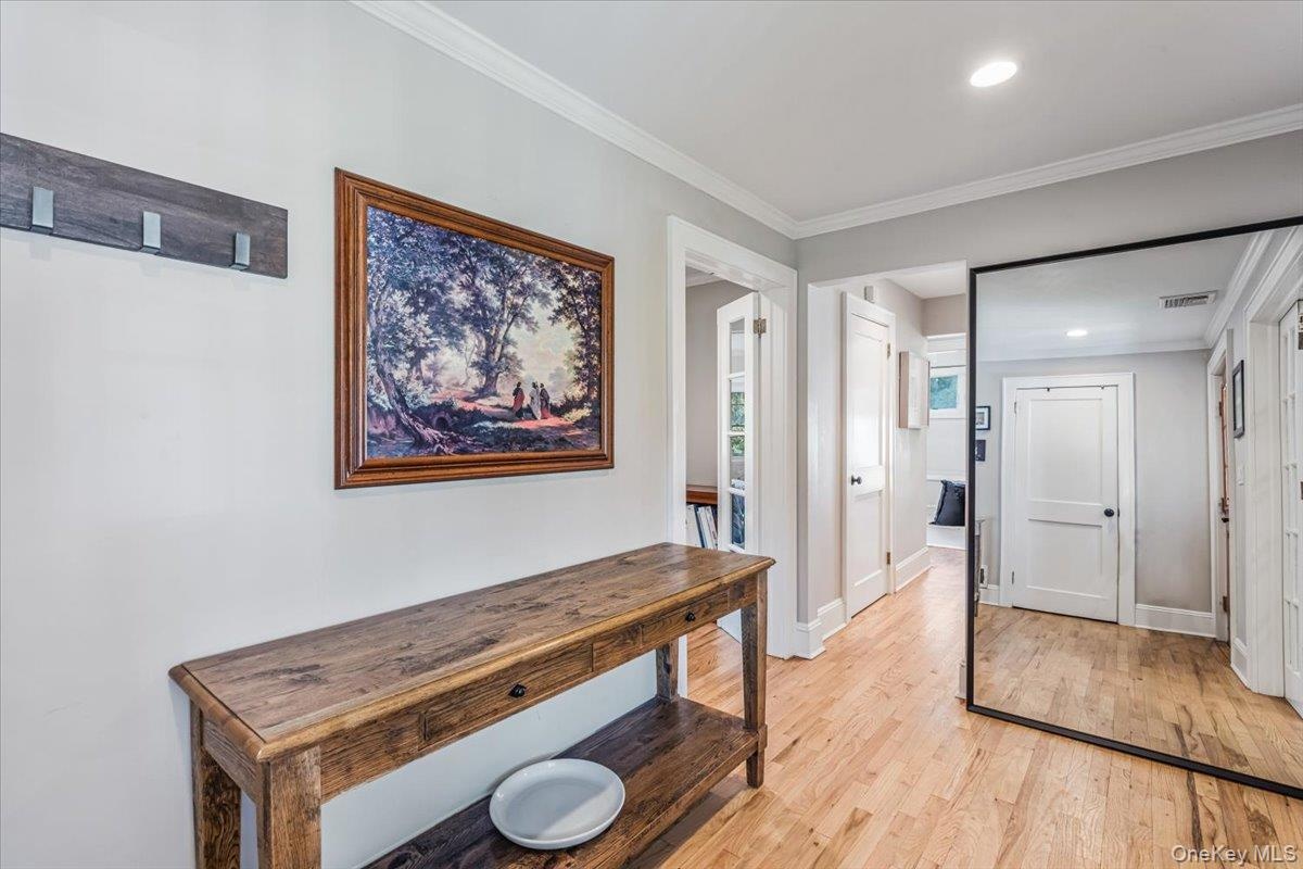 - Hallway with light wood finished floors, baseboards, crown molding, and recessed lighting