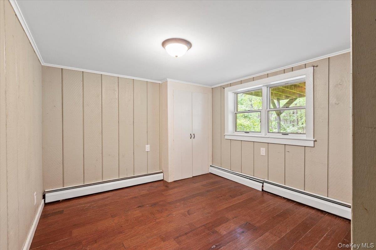 - Unfurnished bedroom featuring baseboard heating and wood finished floors