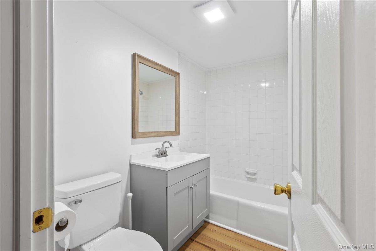 - Bathroom with vanity, toilet, wood finished floors, and tub / shower combination