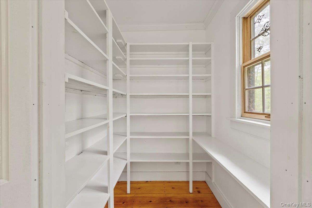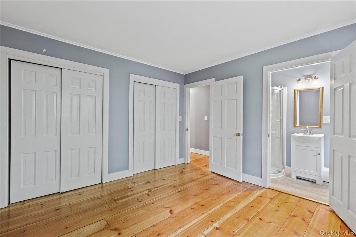 - Unfurnished bedroom with two closets, crown molding, wood-type flooring, a sink, and ensuite bath