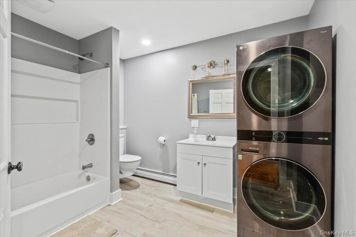 - Bathroom featuring stacked washer and clothes dryer, a baseboard radiator, toilet, vanity, and wood finished floors