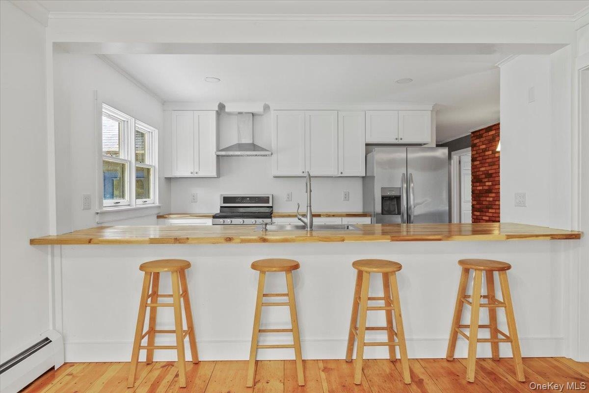 - Kitchen with wood counters, appliances with stainless steel finishes, a baseboard heating unit, wall chimney exhaust hood, and white cabinetry