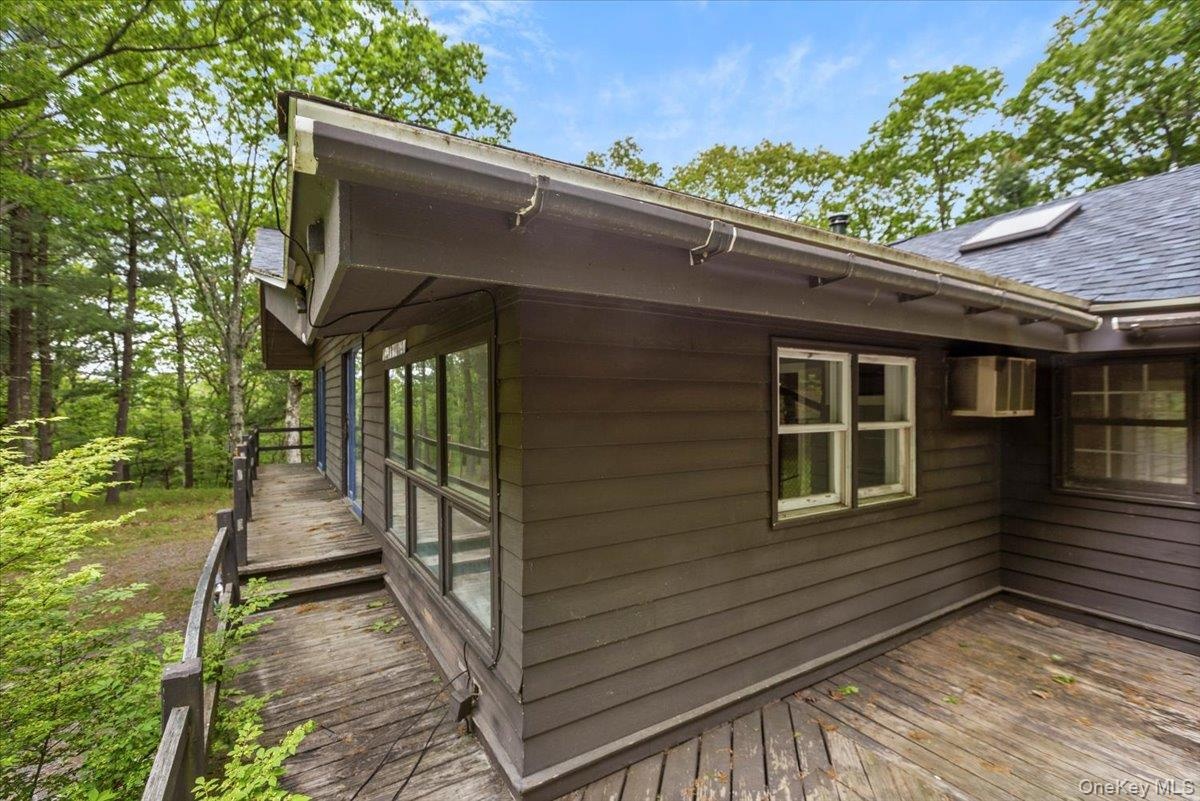 - View of property exterior with a shingled roof, a wooden deck, and a wall mounted AC