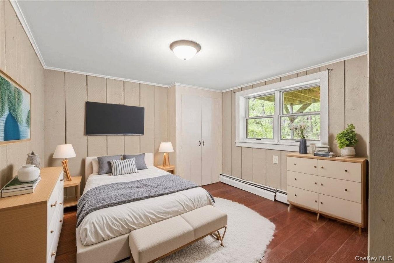 - Virtually Staged Photo - Bedroom featuring crown molding, wood-type flooring, and a baseboard radiator