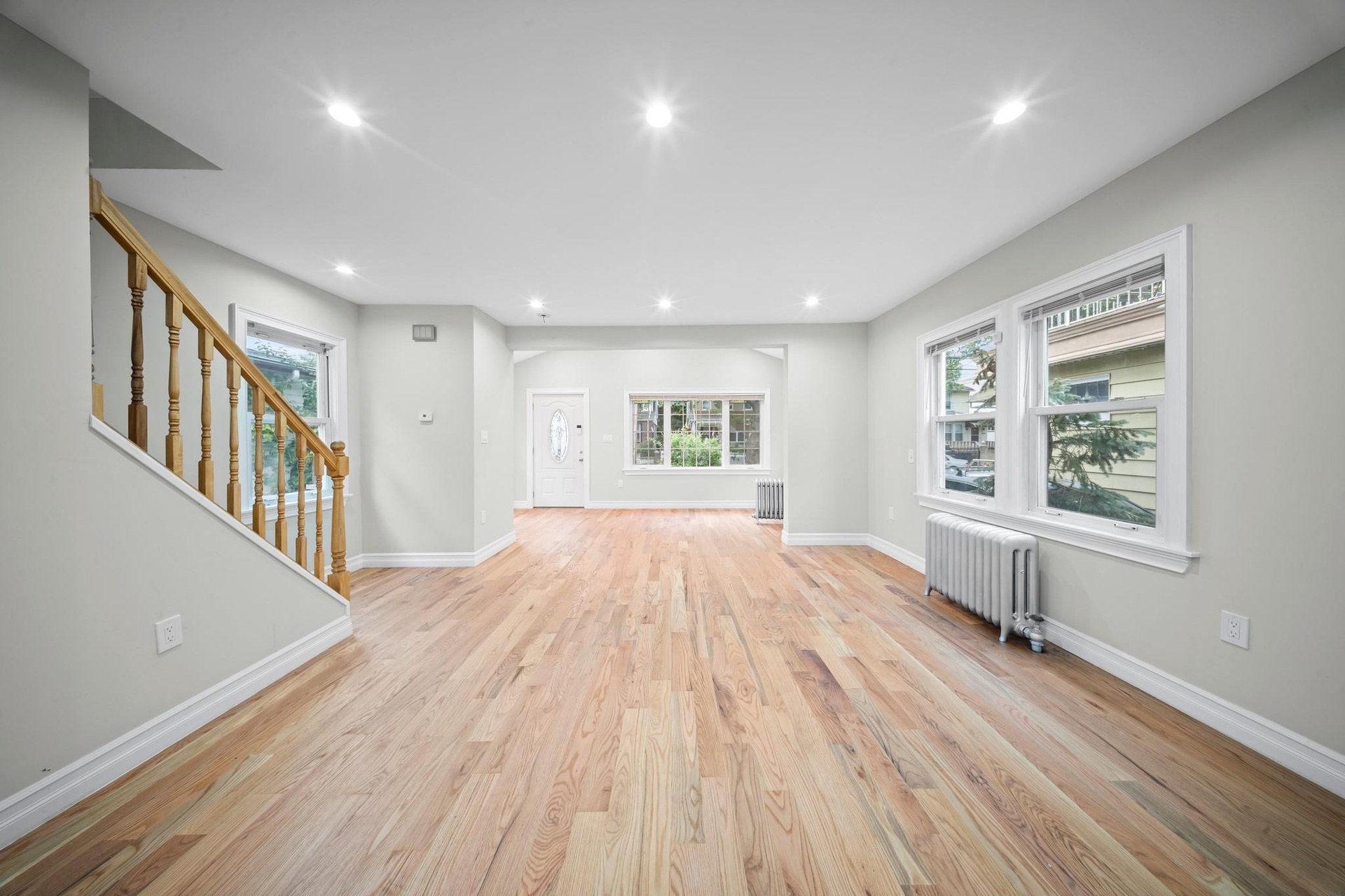 - Unfurnished living room with radiator heating unit, stairway, baseboards, light wood-style floors, and recessed lighting