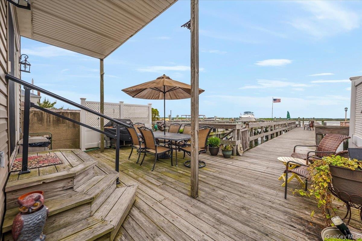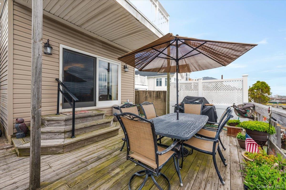 - Wooden terrace featuring outdoor dining area and entry steps