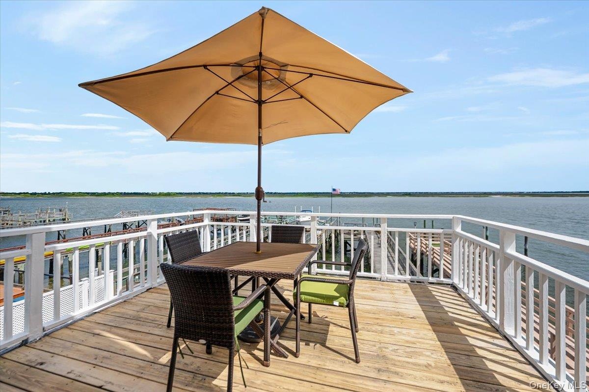 - Deck featuring a water view and outdoor dining space