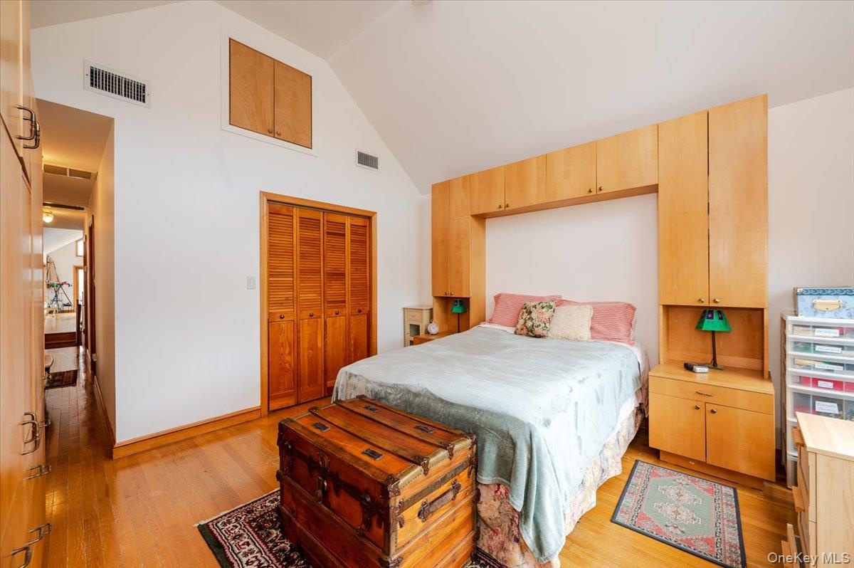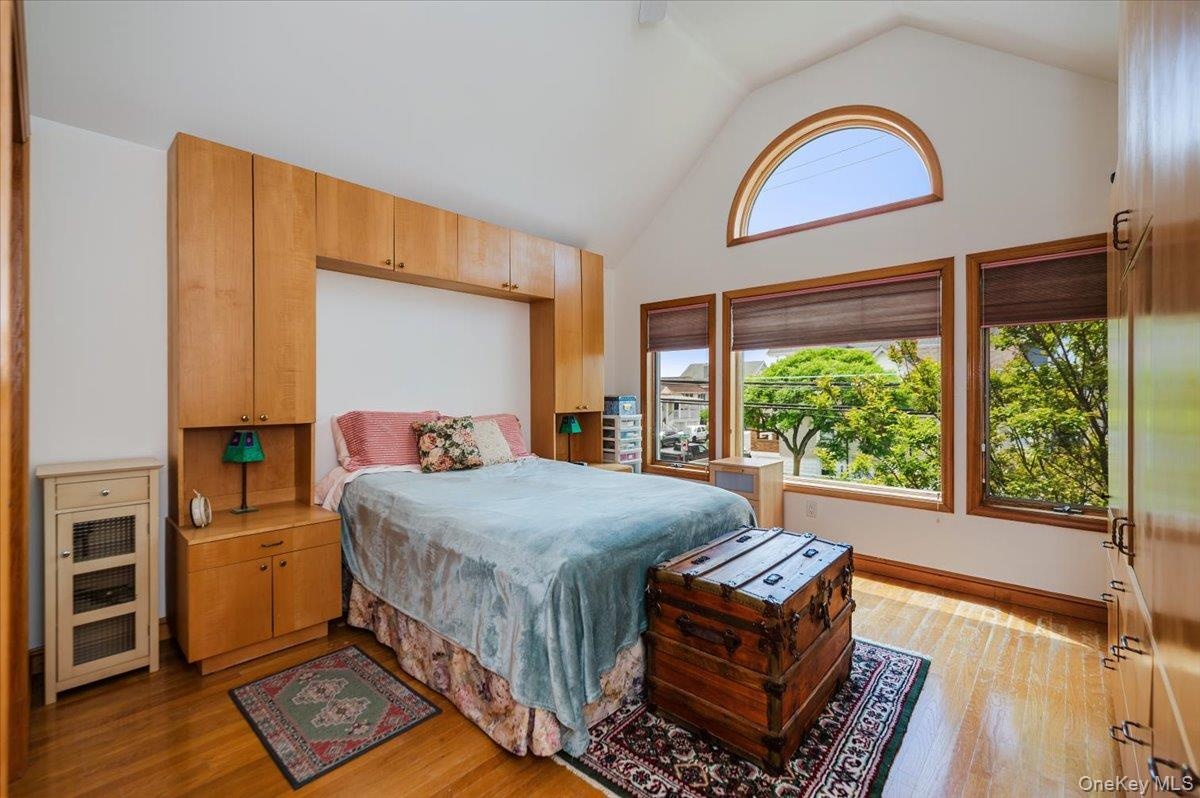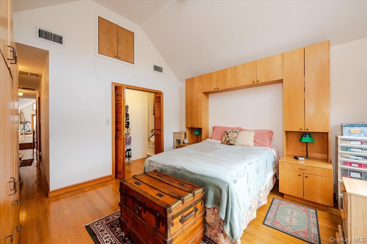 - Bedroom featuring wood finished floors and high vaulted ceiling