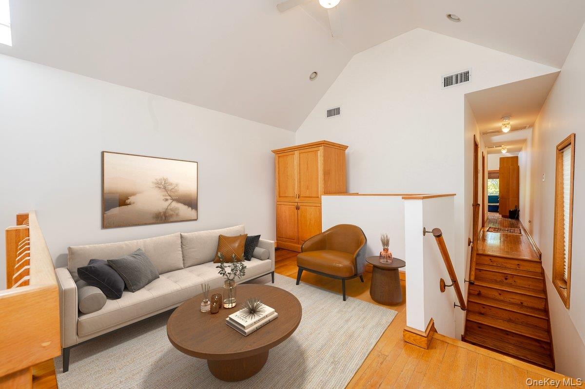 - Living area with light wood-style flooring, high vaulted ceiling, and a ceiling fan