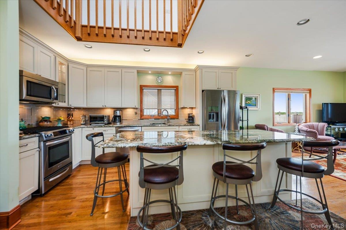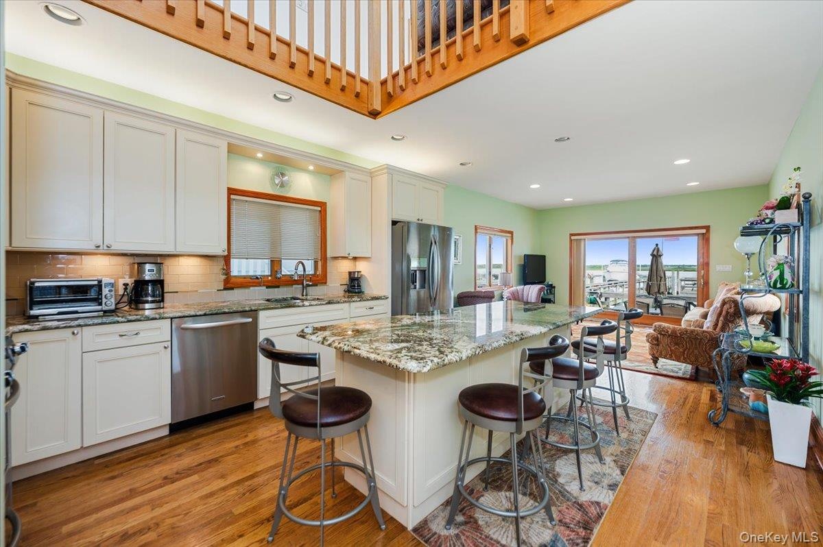 - Kitchen with appliances with stainless steel finishes, a sink, light wood-style flooring, a breakfast bar area, and open floor plan