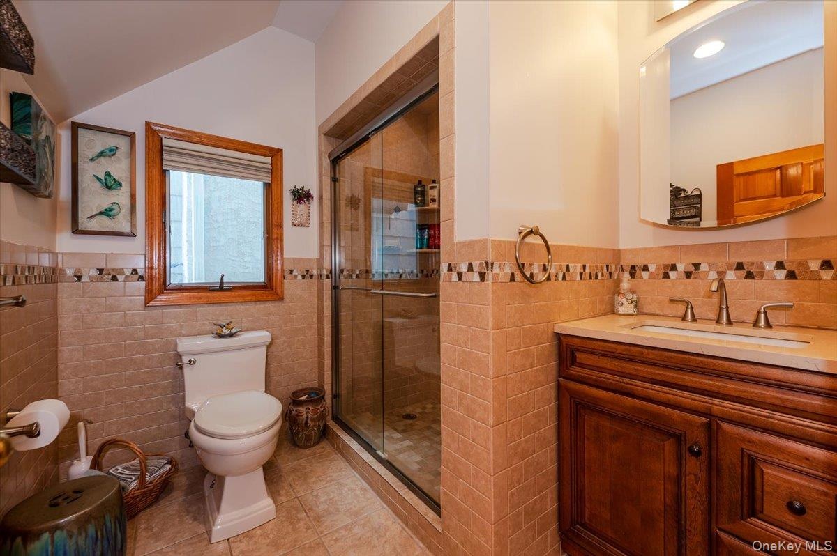 - Bathroom featuring tile walls, tile patterned flooring, vanity, a shower stall, and toilet