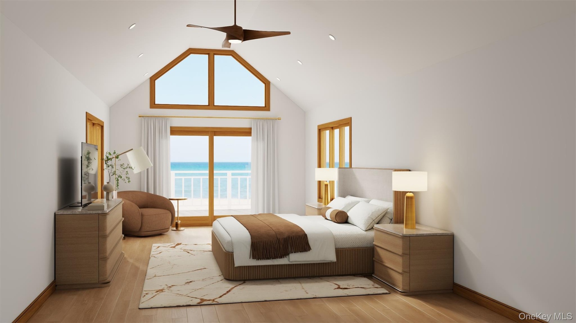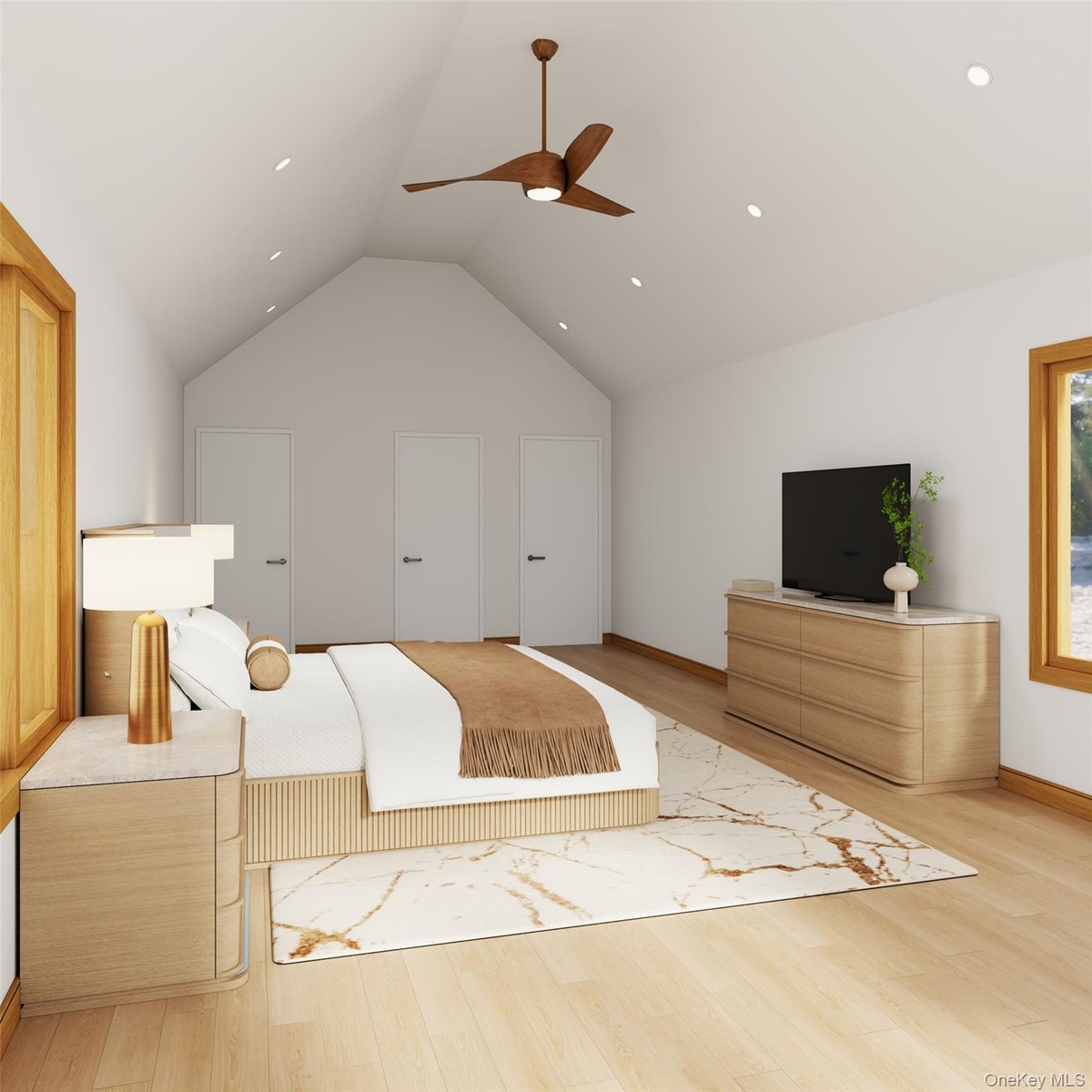 - Bedroom featuring light wood finished floors, a ceiling fan, high vaulted ceiling, and recessed lighting