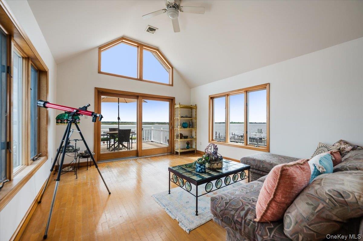 - Living area featuring wood finished floors, lofted ceiling, ceiling fan, and a water view
