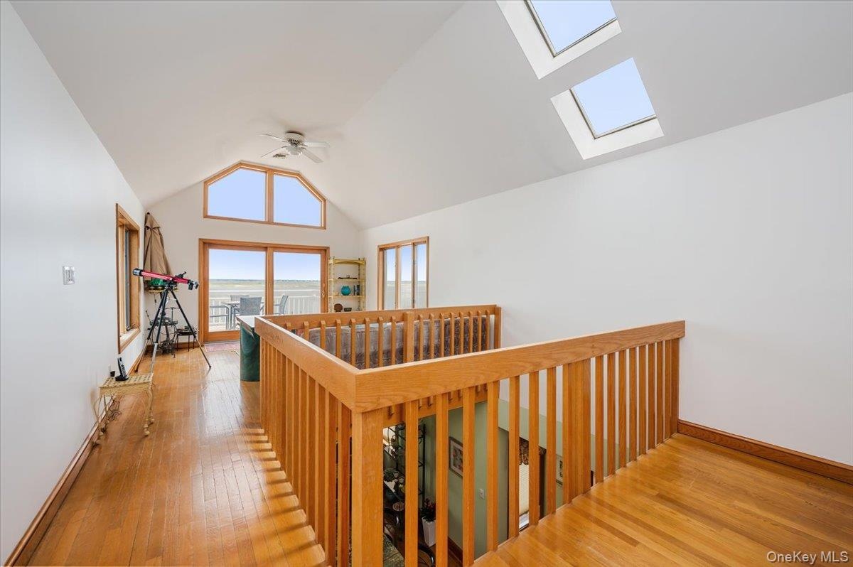 - Hallway with a skylight, wood finished floors, lofted ceiling, an upstairs landing, and baseboards
