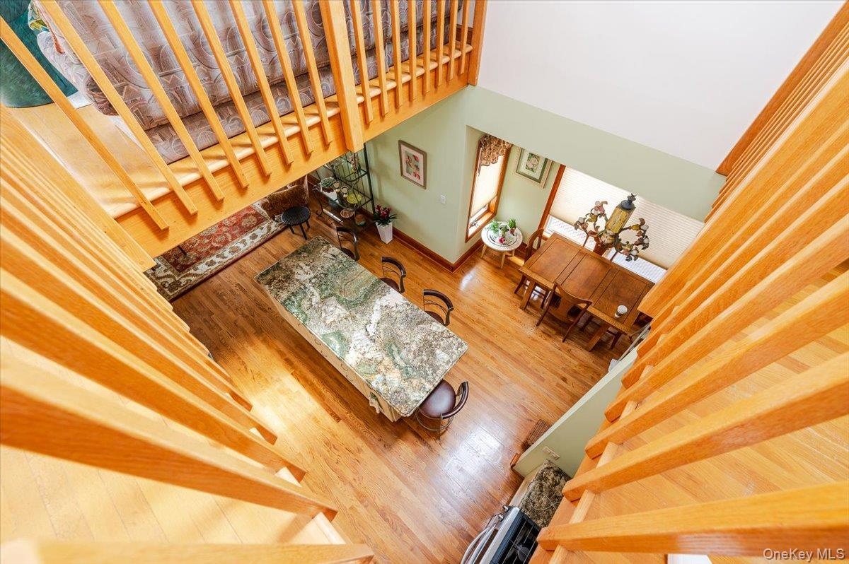 - Stairway with wood finished floors, a high ceiling, and baseboards