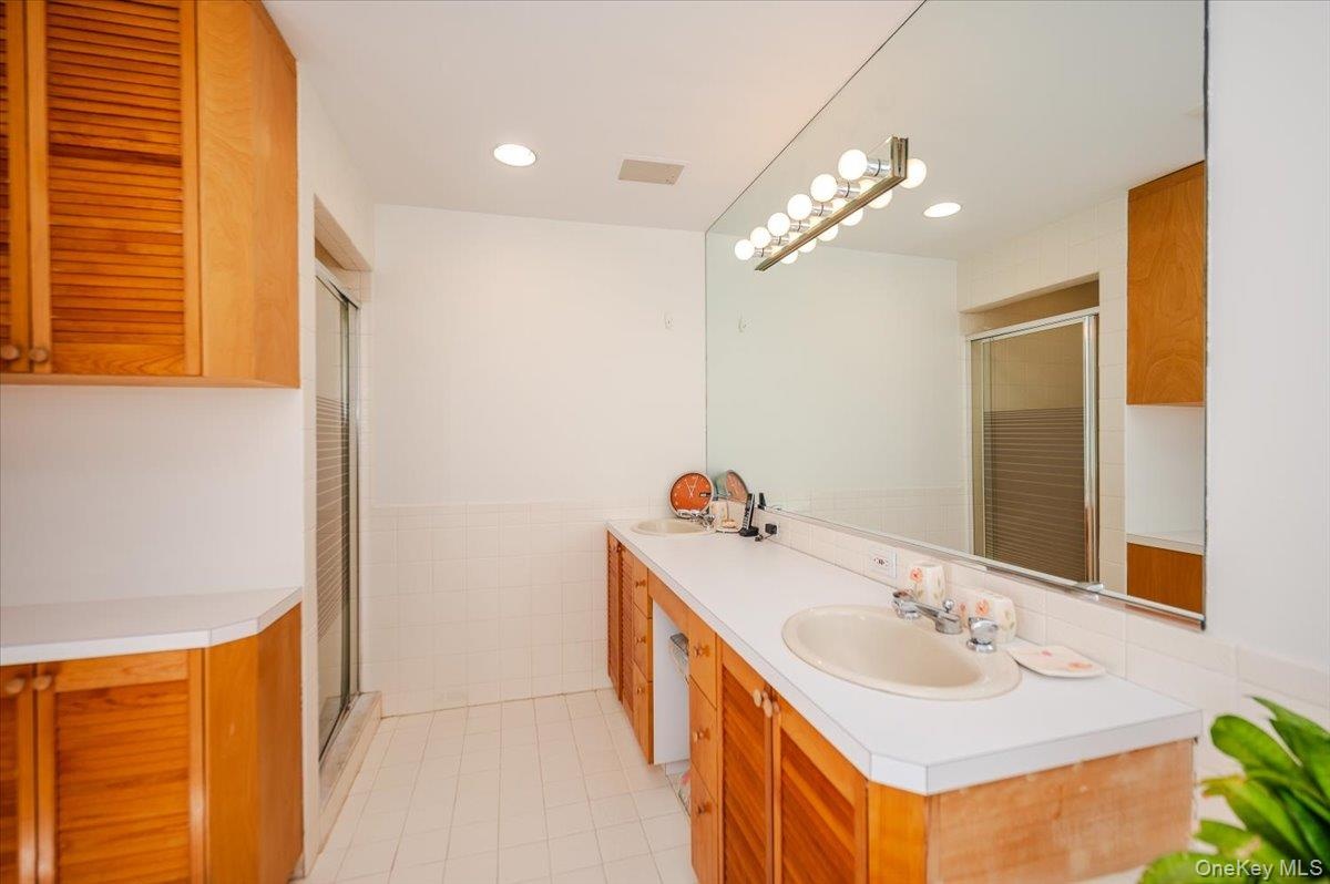 - Bathroom with double vanity, tile patterned flooring, a shower with shower door, recessed lighting, and a wainscoted wall