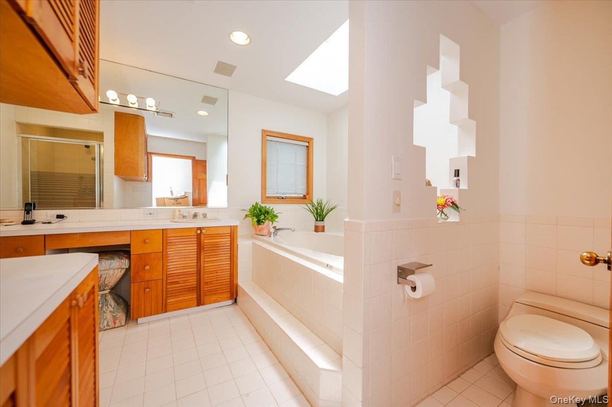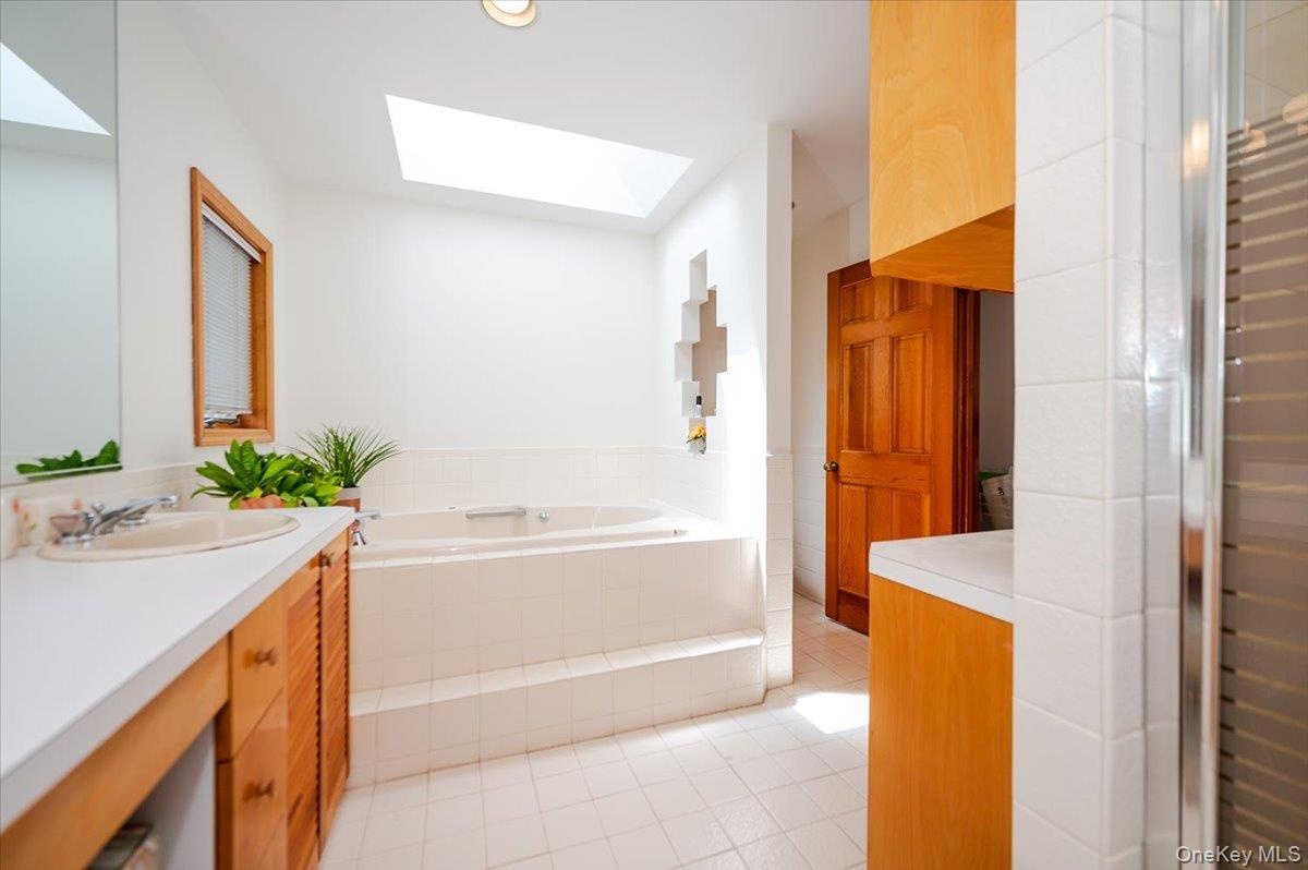 - Full bath featuring a skylight, vanity, tile patterned flooring, and a garden tub