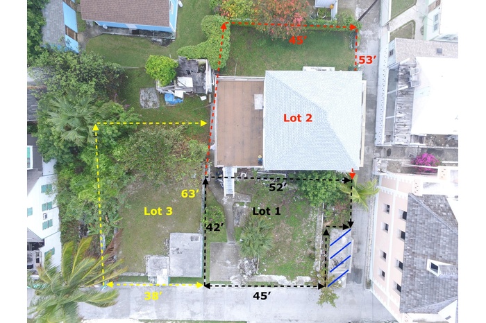 The Settlement House known as "Bougainvillea," accompanied by individual lot numbers 1 and 3, is located in the "Heart" of Downtown New Plymouth, a historical settlement on Green Turtle Cay, Abaco, Bahamas. Comprising approximately 7,400 square feet in total, the 1,752 square foot structure features a concrete ground floor and wood framed second floor. The downstairs layout offers a combined living and dining room at the front, one bedroom to the right, a central bathroom, and a kitchen and second bedroom at the rear. The upstairs level provides two bedrooms, a bathroom, and an open kitchen, living, and dining room. Steps from the Ferry Dock and next to the world-famous Albert Lowe Museum, this property offers an iconic restoration ability to revitalize the site into a quaint bed and breakfast, rental apartments, or commercial space. Green Turtle Cay is known for its out-island charm, where warm and engaging locals make this a true home away from home. This is a rare chance to develop a vibrant piece of history in a growing township near the New Plymouth Inn and the Sculpture Garden