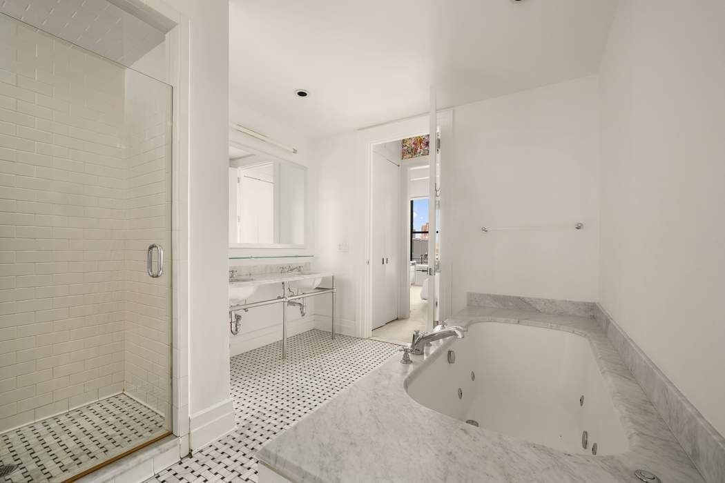 The expansive en-suite primary bedroom showcases spectacular northern views, perfectly framed by oversized windows. It includes a large custom-fitted walk-in closet with additional overhead storage and custom built-in radiator covers with window seating. The en-suite bathroom features a deep soaking spa tub, a separate walk-in shower, and a double vanity with a marble countertop.