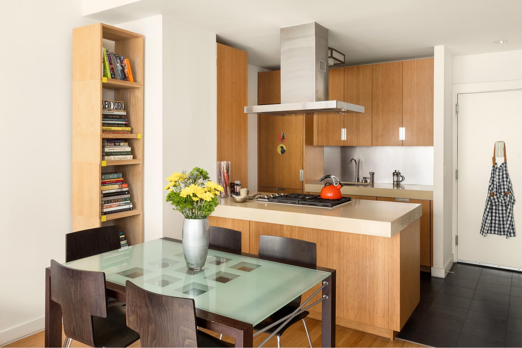 As you enter there is a well-designed & beautifully appointed open plan kitchen with Bamboo cabinetry, premium Viking, Subzero, and Miele appliances, and a wide eat-at counter that adjoins the spacious living room with attractive Bamboo flooring.