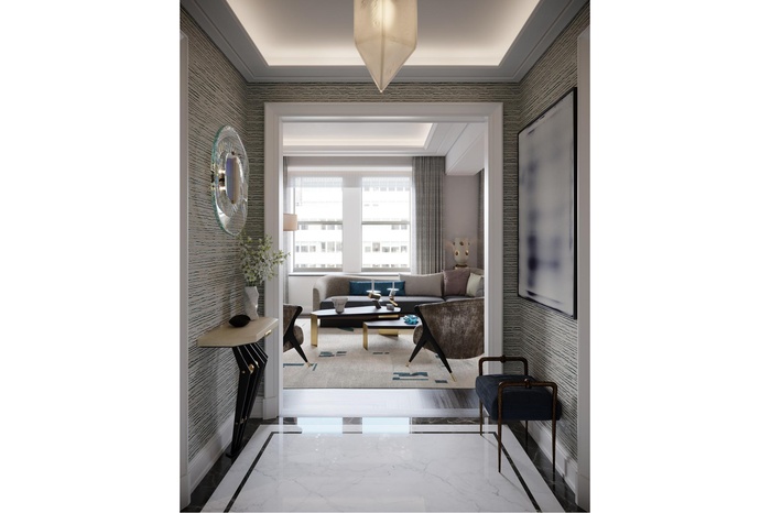 Designed by internationally acclaimed designer Jean-Louis Deniot, residences combine modern comfort with signature features such as a dedicated Concierge Closet and keyless entry with opulent details like ceiling coves, herringbone floors, oversized custom-paneled doors, spacious walk-in closets, and grand entry foyers with marble floors and brass inlays .