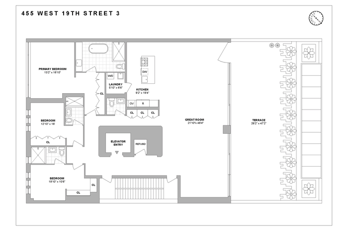 455 W 19th Street, Residence 3 is an ultra-modern, 3 bedroom, 3.5 bathroom luxury full-floor condominium with a spectacular, 1,225 square foot private terrace directly off of the great room. This contemporary masterpiece has sophisticated finishes, 10' ceilings, abundant natural light throughout, and a 47’ wide great room.