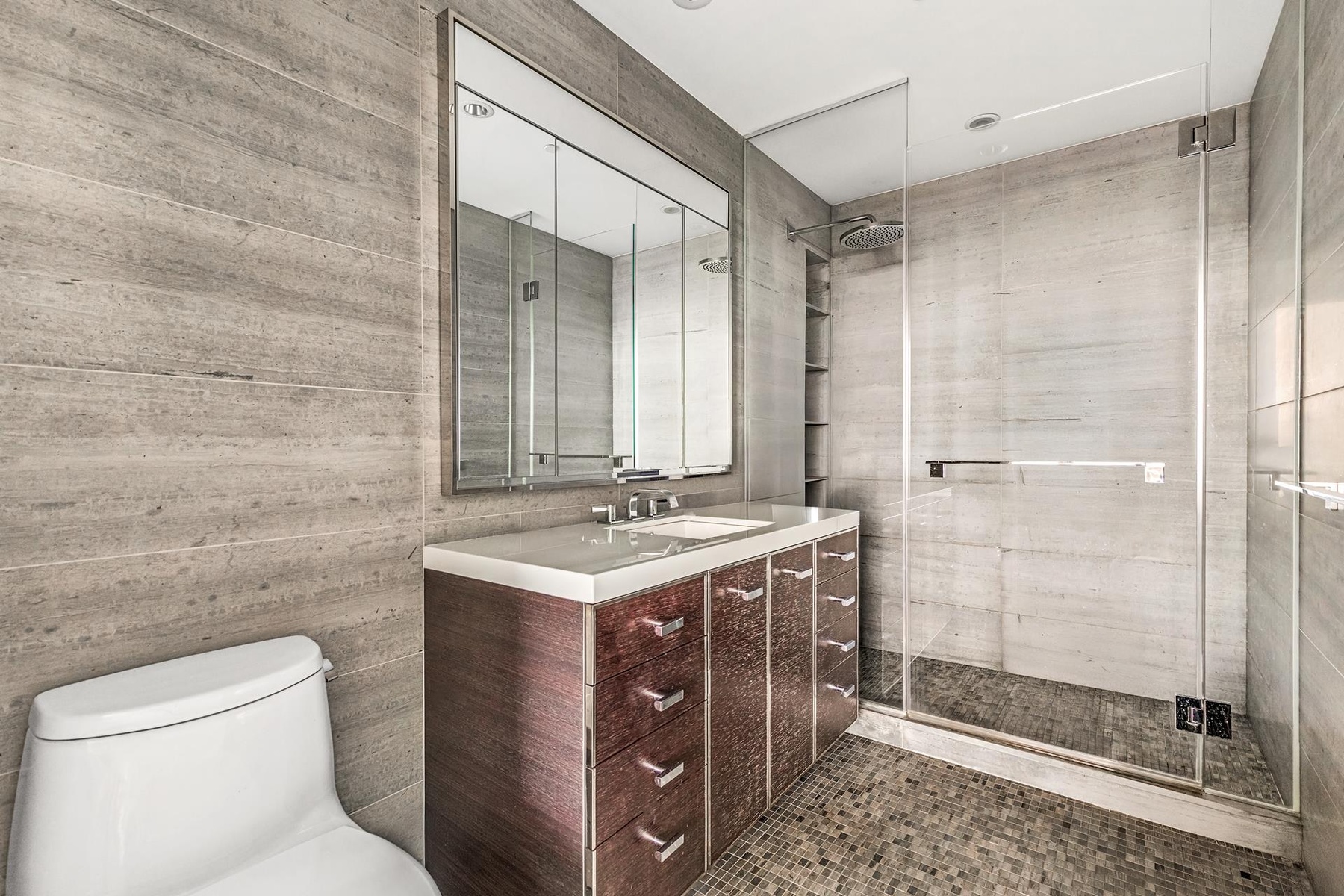 The spacious primary bedroom enjoys a large closet and en suite bath with radiant heated floors, mosaic tiles, bespoke wood cabinetry, and Dornbracht polished chrome fixtures and faucet. Other hallmarks of this unique home include ebony stained oak hardwood floors, two-zone central A/C and heat, Bosch stackable washer/dryer units, app-controlled window shades in all rooms, and customized closet organizers throughout.
