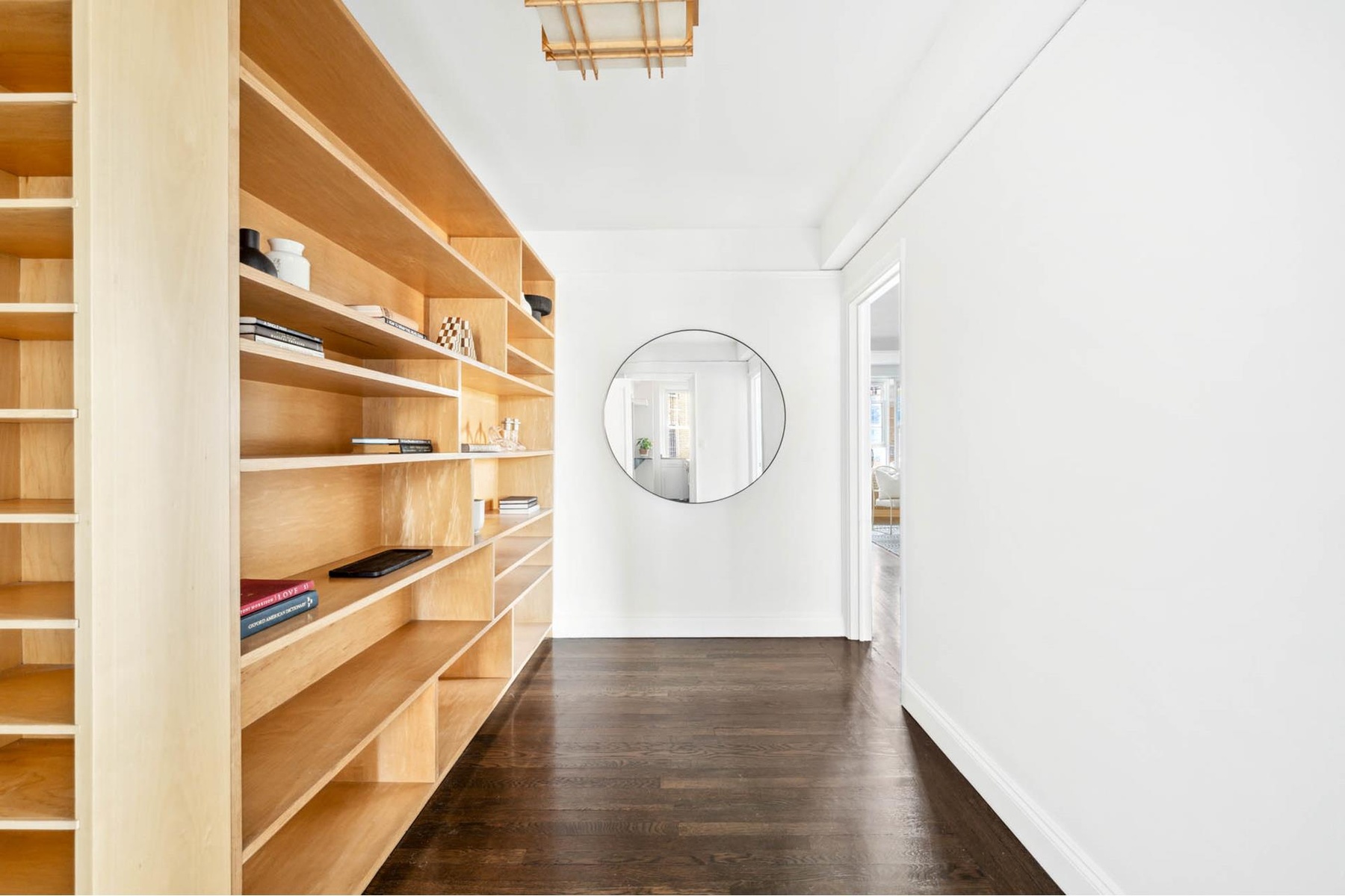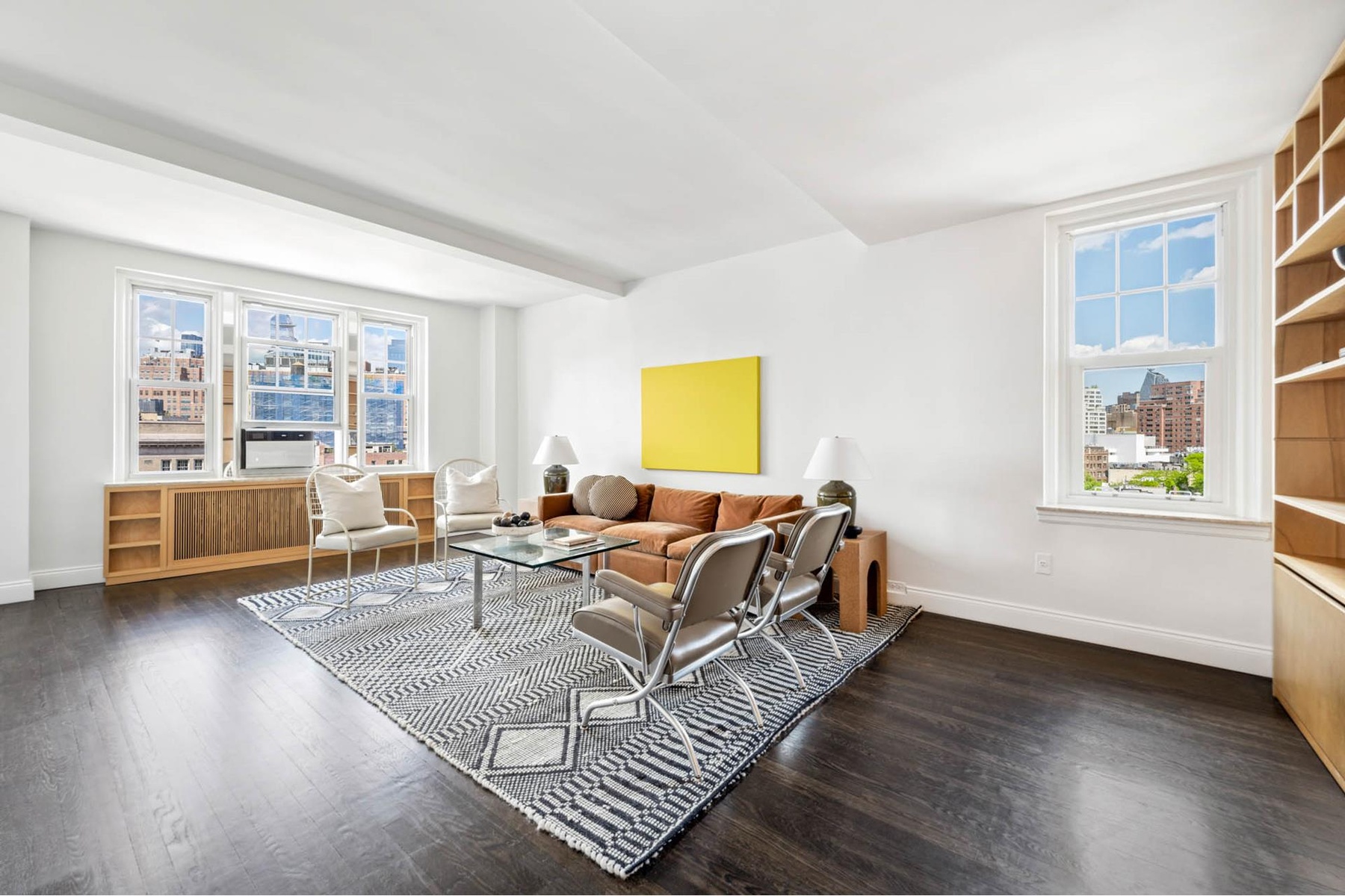 Set high on the tenth floor, this rarely available, oversized one-bedroom is the most coveted layout in the historic Bing & Bing condominium on Abingdon Square. A high-floor corner residence, it boasts three open exposures with sweeping, protected views over the West Village. Pre-war elegance meets thoughtful design with a formal entry foyer and two walk-in closets that open to a generous gallery-perfect as a dining area or home office. The windowed kitchen, sunlit living room with custom-built bookshelves, and king-sized bedroom with two exposures and a windowed bath offer gracious living. Beautiful original floors, beamed ceilings, vintage moldings, brass hardware, and double-pane windows add timeless character. This full-service building includes a 24-hour doorman, live-in super, porter, bike room, storage, laundry, and a newly landscaped rooftop with panoramic skyline views. Hallways and elevators have been upgraded, and a tasteful lobby renovation is nearing completion.