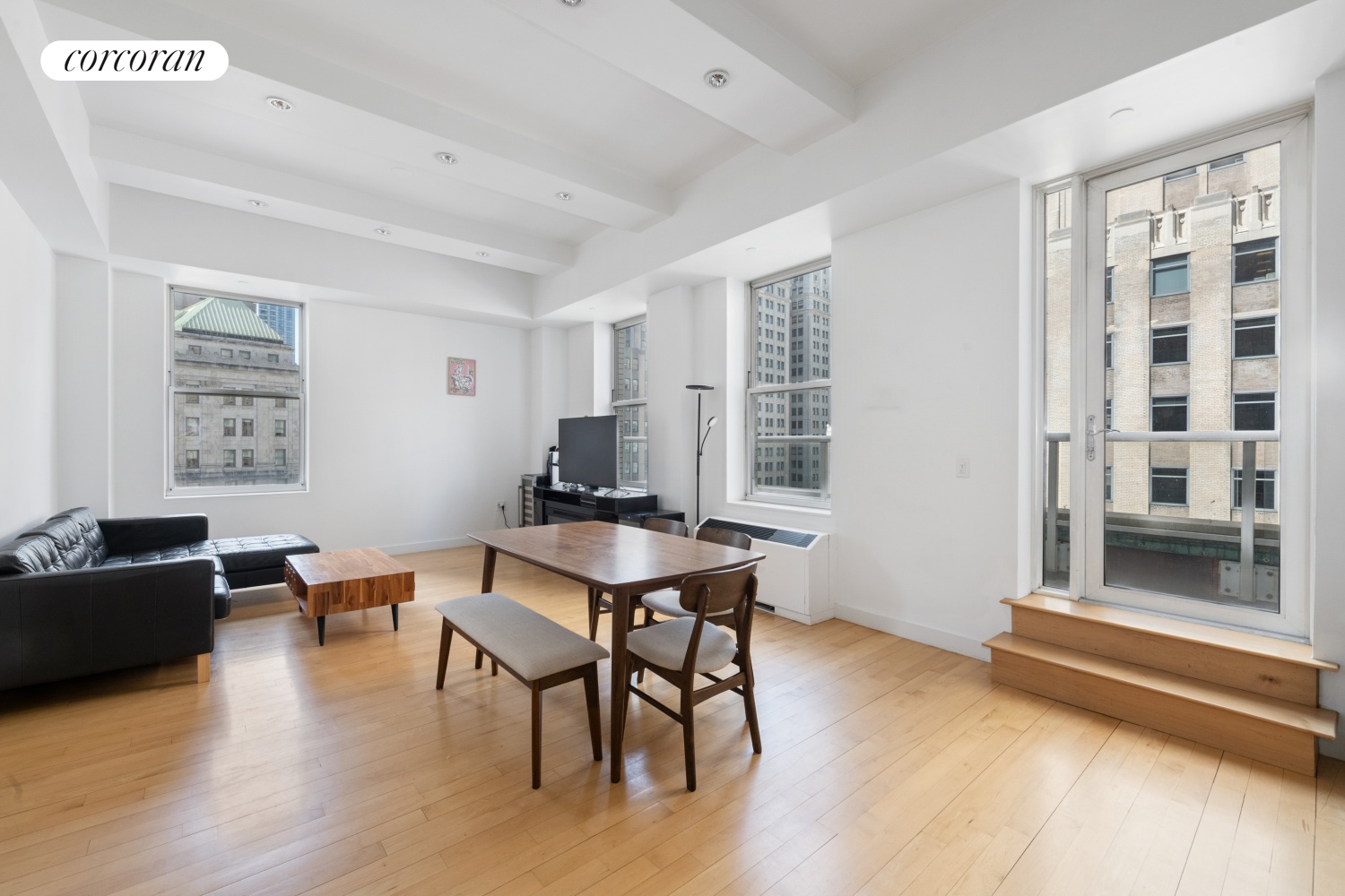 Welcome to residence 2400, a stunning corner unit 2-bedroom 2-bathroom condo, at Downtown by Philippe Starck, one of FiDi's premier amenity filled residential luxury condos. 4" maple hardwood floors and soaring 11" loft beamed ceilings give a true sense of grandeur while natural light floods the apartment throughout the day through northern and western exposures.
