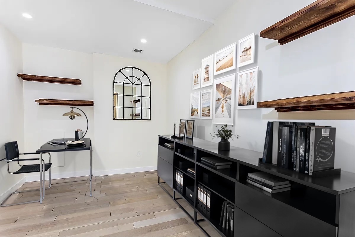 Spanning 2100 SF, the home is sun-drenched from southern and western exposures, with oversized windows framing skyline and park views. The dedicated home office easily functions as a fourth bedroom, den, or guest space, ideal for today’s hybrid lifestyle.