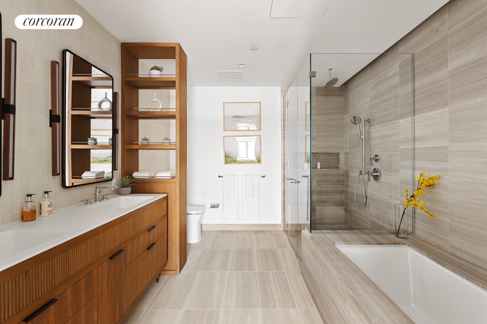 On the upper level, the primary bedroom suite features dual walk-in closets and a spa like five-fixture primary bath with a custom fluted frozen walnut veneered vanity with Corian countertop, Kohler Purist chrome fixtures, honed Haisa Light marble floors, and a custom walnut storage niche.