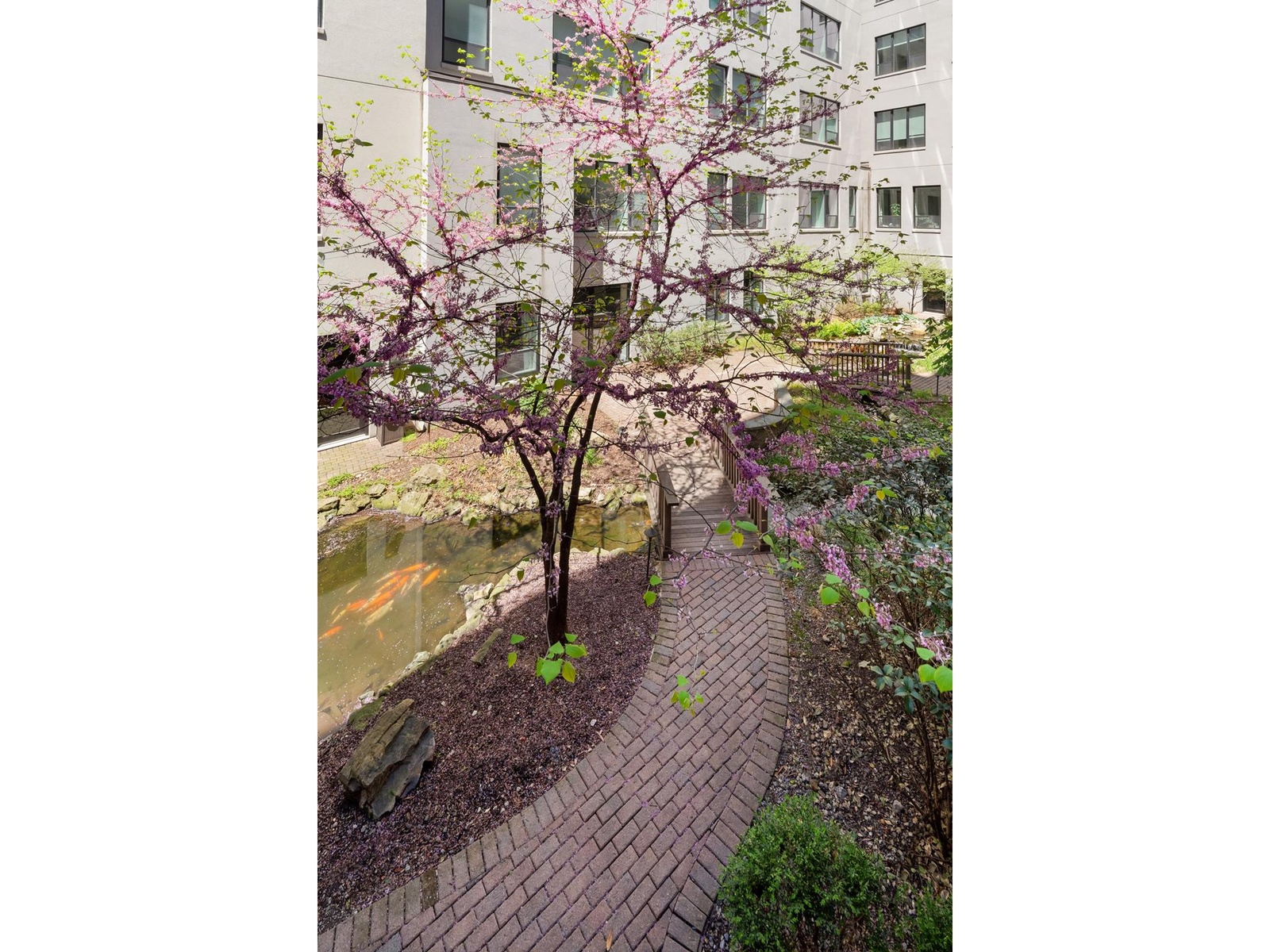 Oversized windows overlooking a serene, landscaped courtyard with a tranquil Koi pond