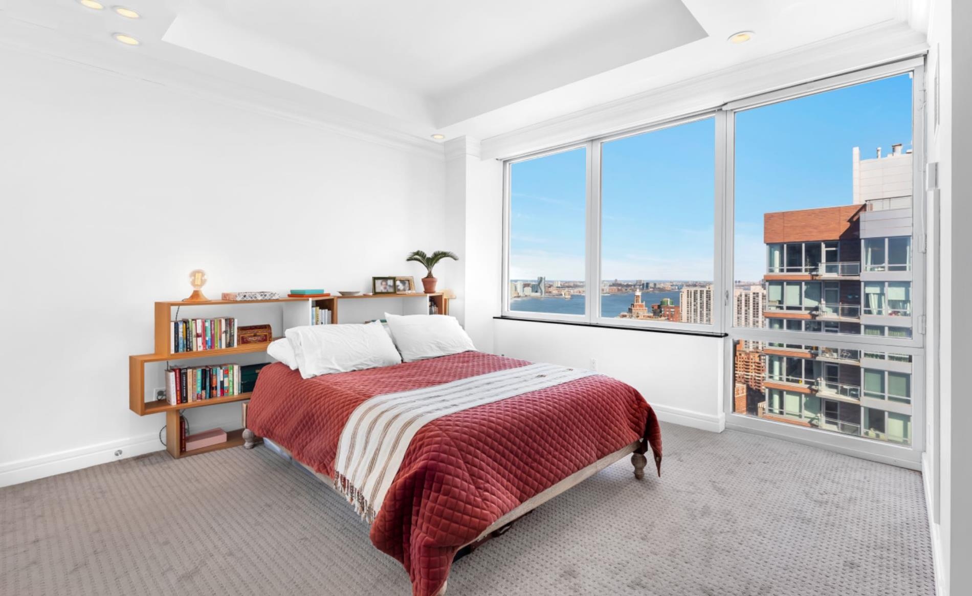 Situated in a prestigious white glove condo, this Ritz-Carlton residence boasts panoramic views of the Hudson River and the Freedom Tower. The sleek marble in the entry foyer sets the tone for the entire space and contains a greeting area, hall closet, and a powder room with an in-unit washer/dryer.