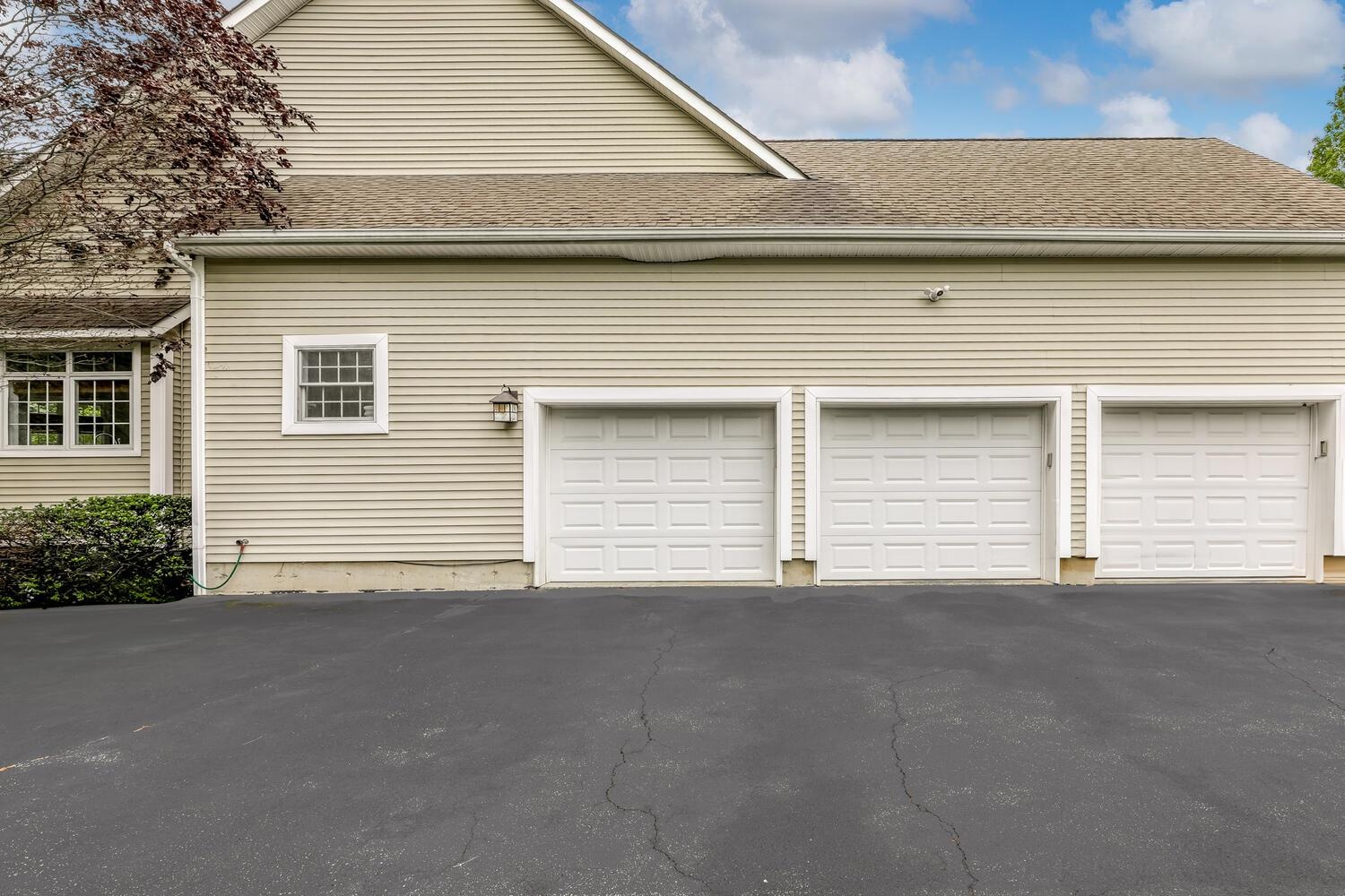 - View of side of home with asphalt driveway, roof with shingles, and an attached garage