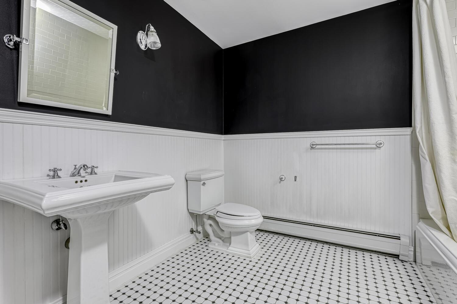 - Full bath with a baseboard heating unit, toilet, a wainscoted wall, a sink, and baseboards