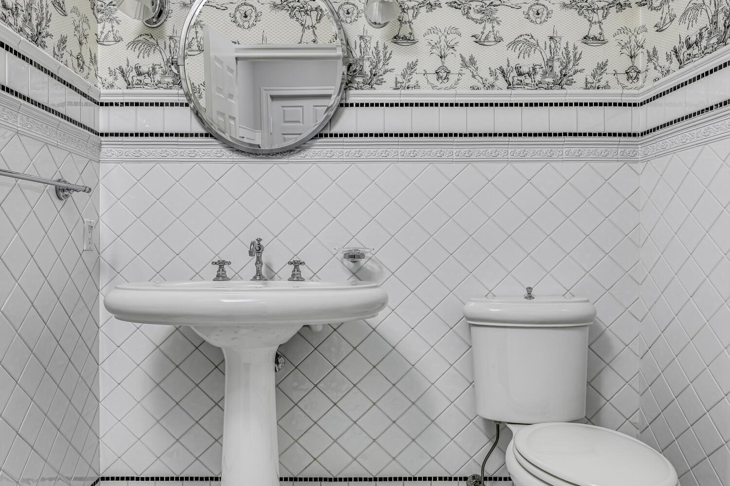 - Half bath featuring wallpapered walls, toilet, a wainscoted wall, and tile walls