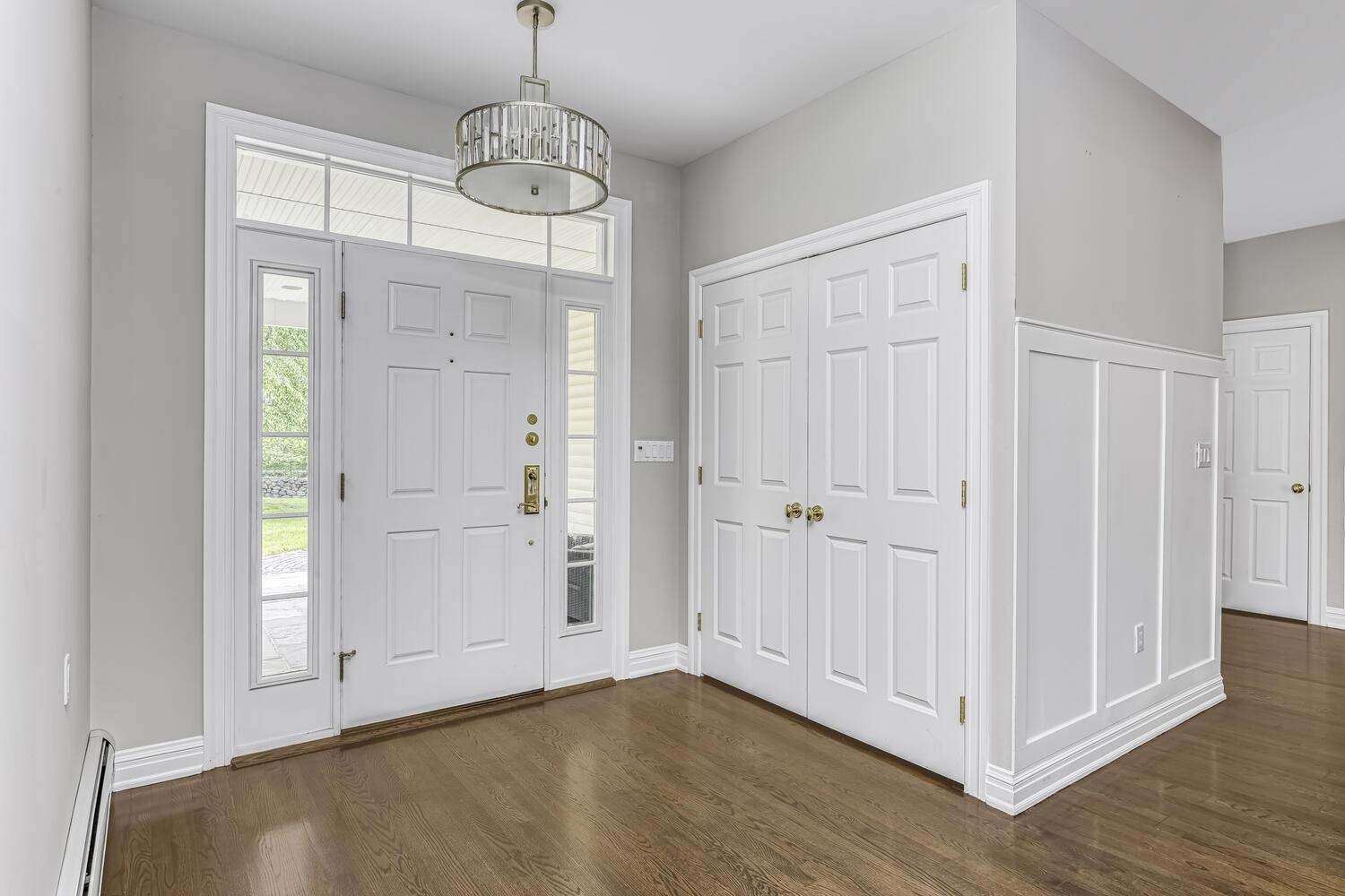 - Foyer entrance featuring dark wood-type flooring, a baseboard radiator, and baseboards