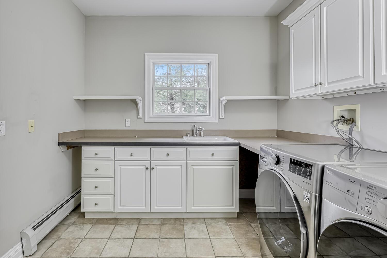 - Laundry area with baseboard heating, cabinet space, and washer and dryer