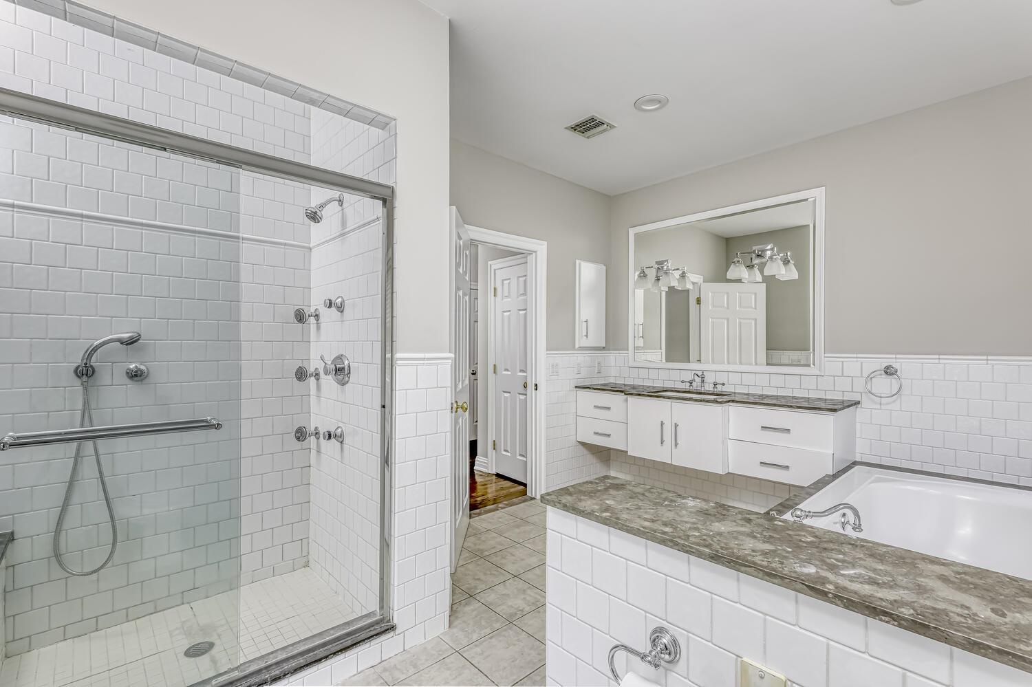 - Bathroom with tile walls, a stall shower, a garden tub, vanity, and tile patterned floors