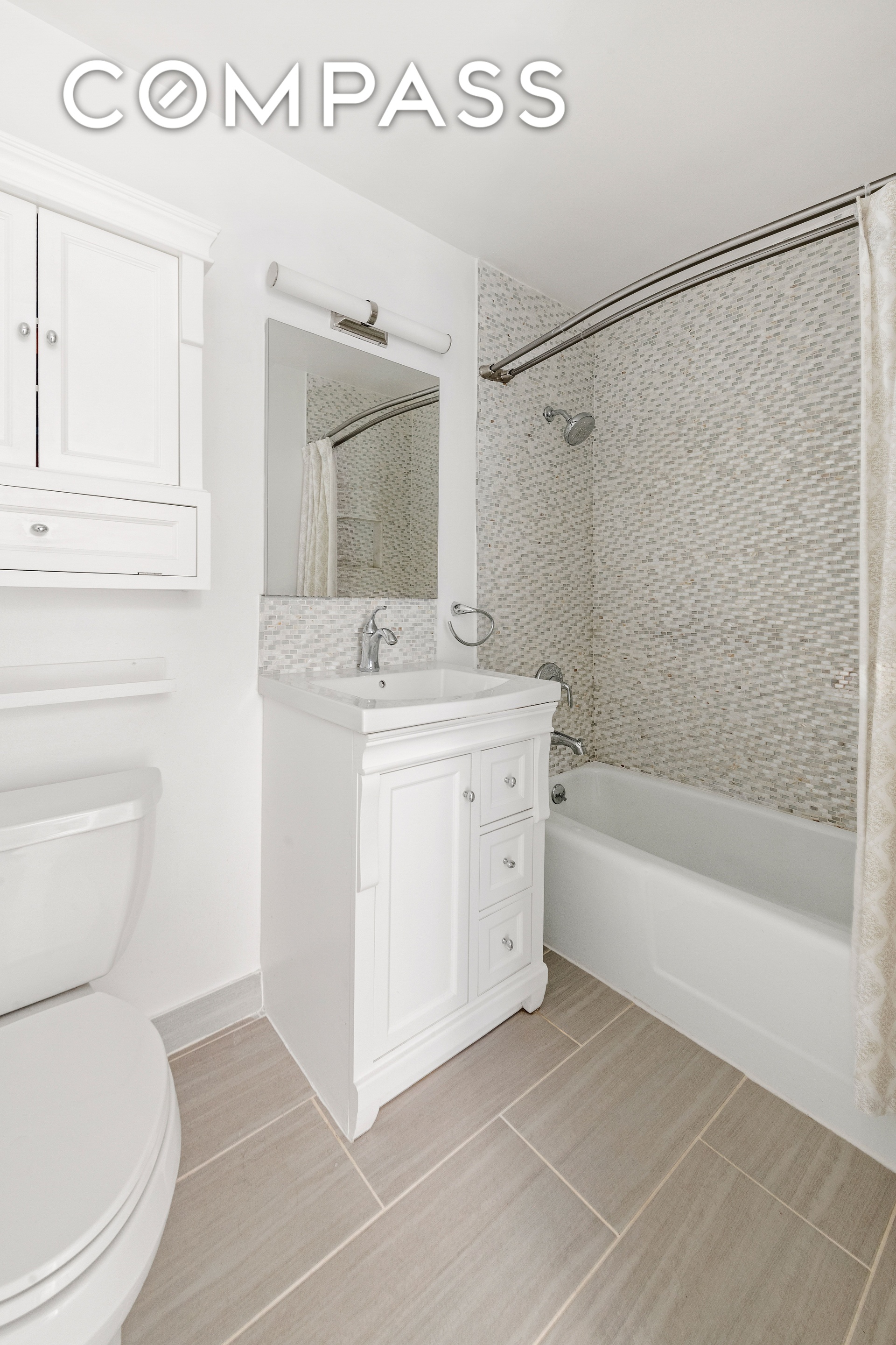 Upon entry, a wall of floor-to-ceiling closets provides generous storage, while the spacious bathroom offers a spa-like experience.