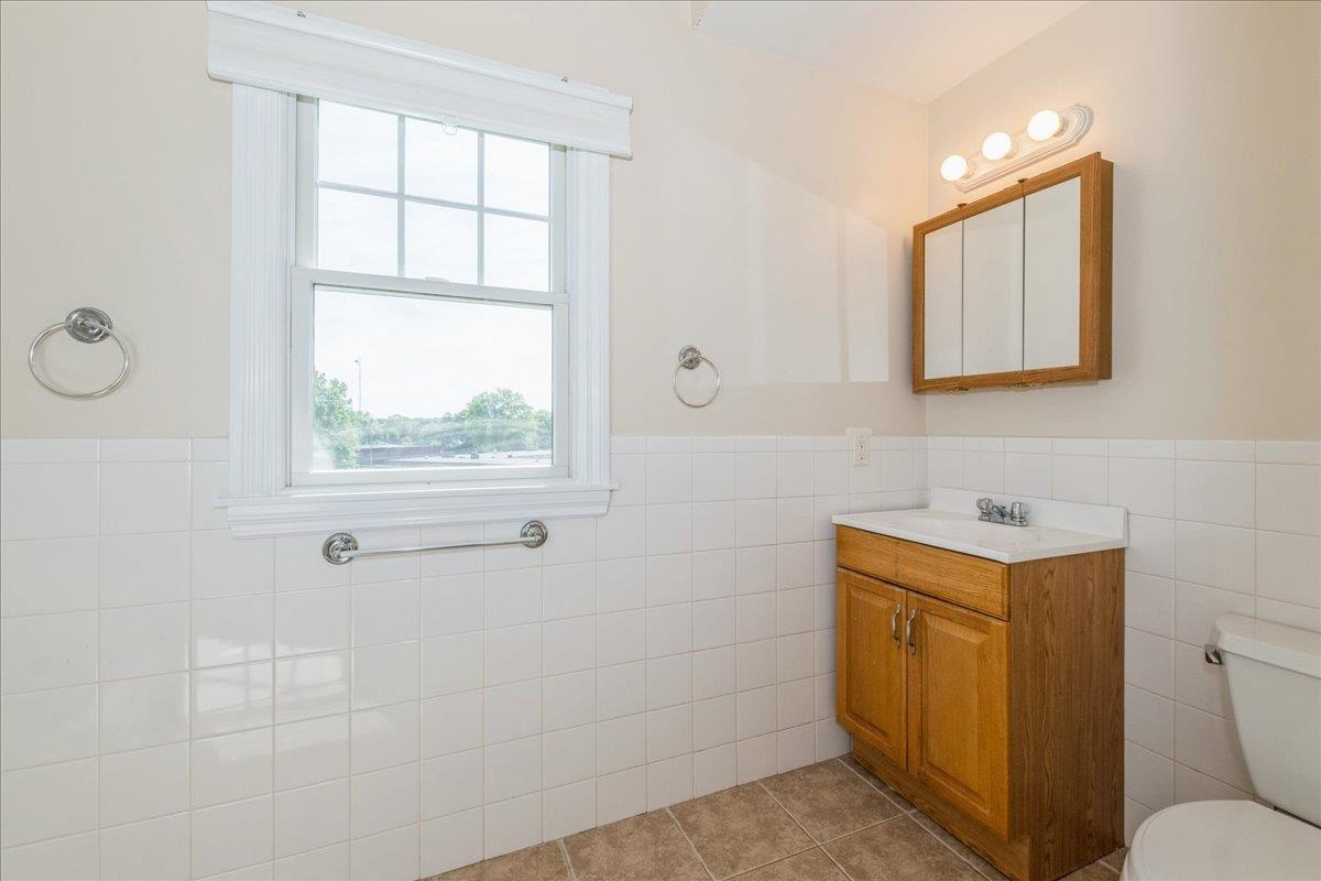 - Bathroom featuring tile walls, toilet, vanity, tile patterned floors, and wainscoting