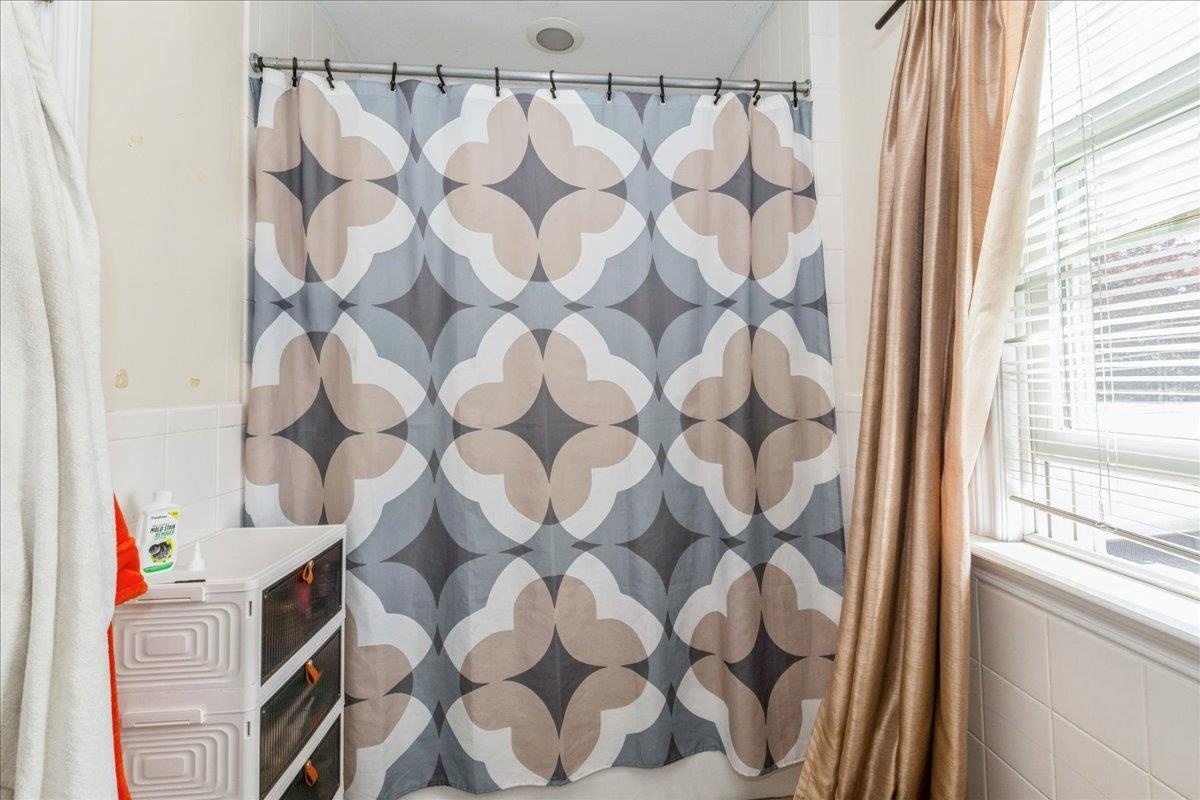 - Bathroom with healthy amount of natural light, shower combination, tile patterned floors, and tile walls