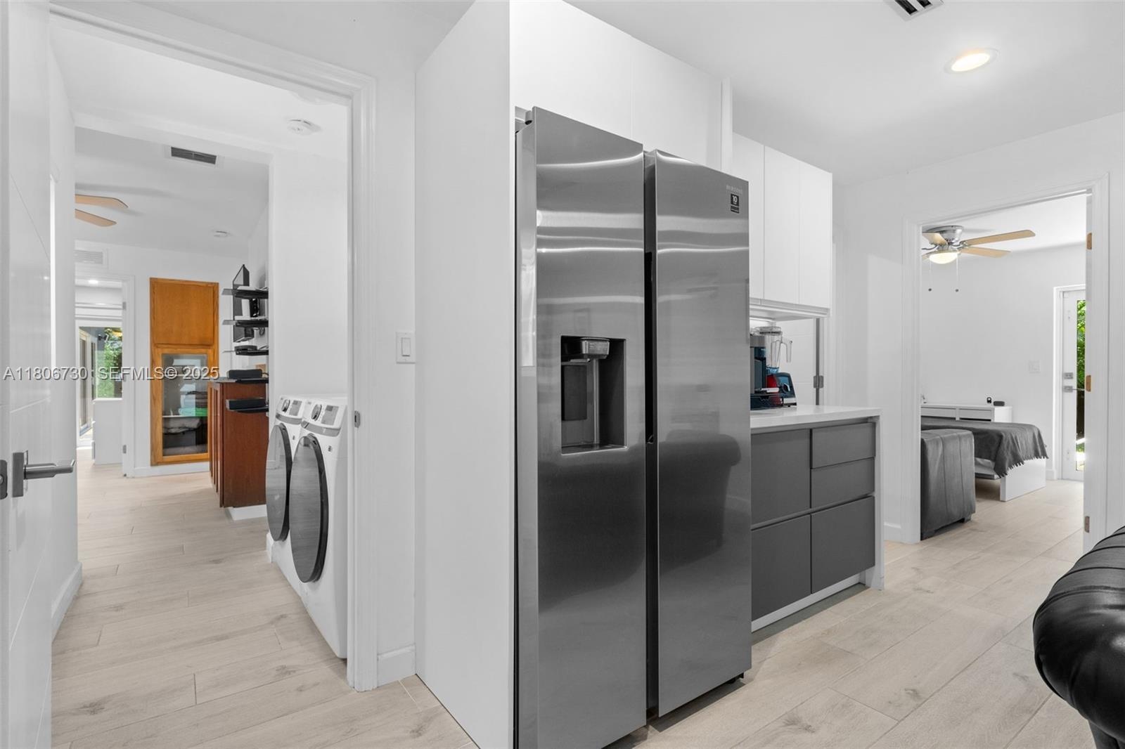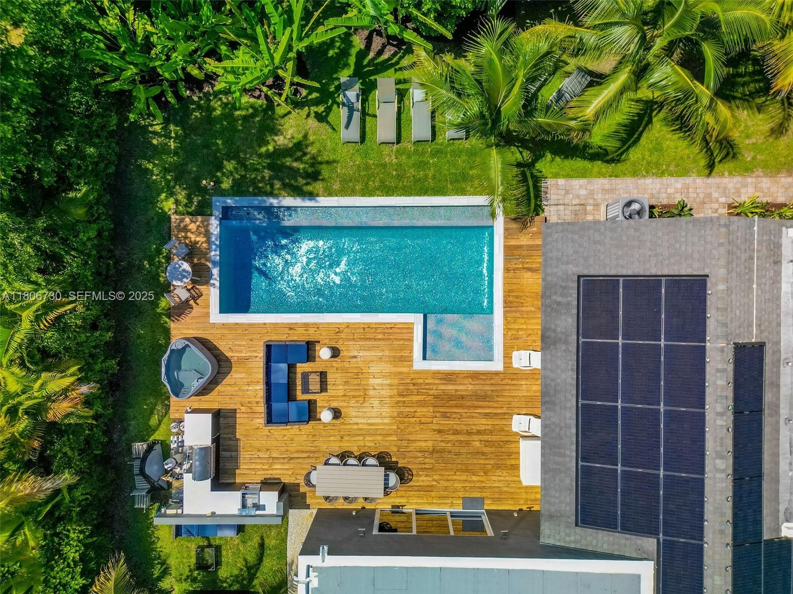 Prepare to be amazed by this 5 BED / 3.5 BATH pool home located in this quiet South Miami neighborhood on an oversized lot! Upon entering you are welcomed by a spacious living room and an open kitchen with cooking island, granite countertops, commercial stainless steel appliances & wooden cabinets boasting generous storage potential. Primary suite features a floor-to-ceiling tile shower. Fully fenced backyard with fruit trees, infinity pool, spa, wood deck and outdoor kitchen is your favorite spot to sip your coffee, sunbathe and enjoy gatherings with friends and family. Home has complete impact protection. Second living room with kitchenette ideal for guests! Solar panels with Tesla Batteries and a large storage container complete the offering. A Beautiful Miami Home! MAKE IT REIN!