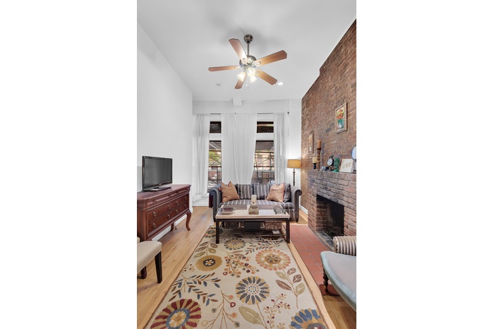 This one-of-a-kind residence features dramatic double-height ceilings and a versatile sleeping loft, perfect for added living space, storage, or effortlessly hosting guests. Oversized north-facing windows bathe the home in natural light, accentuating the stunning exposed brick walls, soaring ceilings, and a wood-burning fireplace that brings together classic pre-war character and modern comfort.