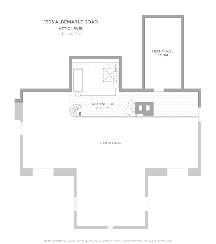 Upstairs is the former ballroom with over 16-foot-high ceilings, where in 1908 George E. and Sarah Gale hosted more than 300 guests for live musical performances and grand revelry. For today's lifestyle, the upper level houses generous guest suites, lounges, a media room, home workspace, and the ideal environs for casual family fun with friends. The ballroom has been opened up to the attic to create a soaring ceiling and designed with a vintage bar that stretches along one wall for decadent home entertainment. You're transported to a London speakeasy-a magnificent place to share with friends. A spiral staircase leads up to a mezzanine. This floor is supported by three more bedrooms, a recreation room, mechanical room, and walk-in closet. A charming attic space features a sunlit reading loft overlooking the levels below-ideal for a home office, art studio, or snug. There are two full bathrooms on the third floor for guest use.