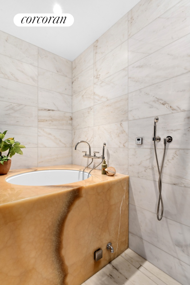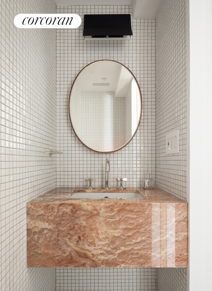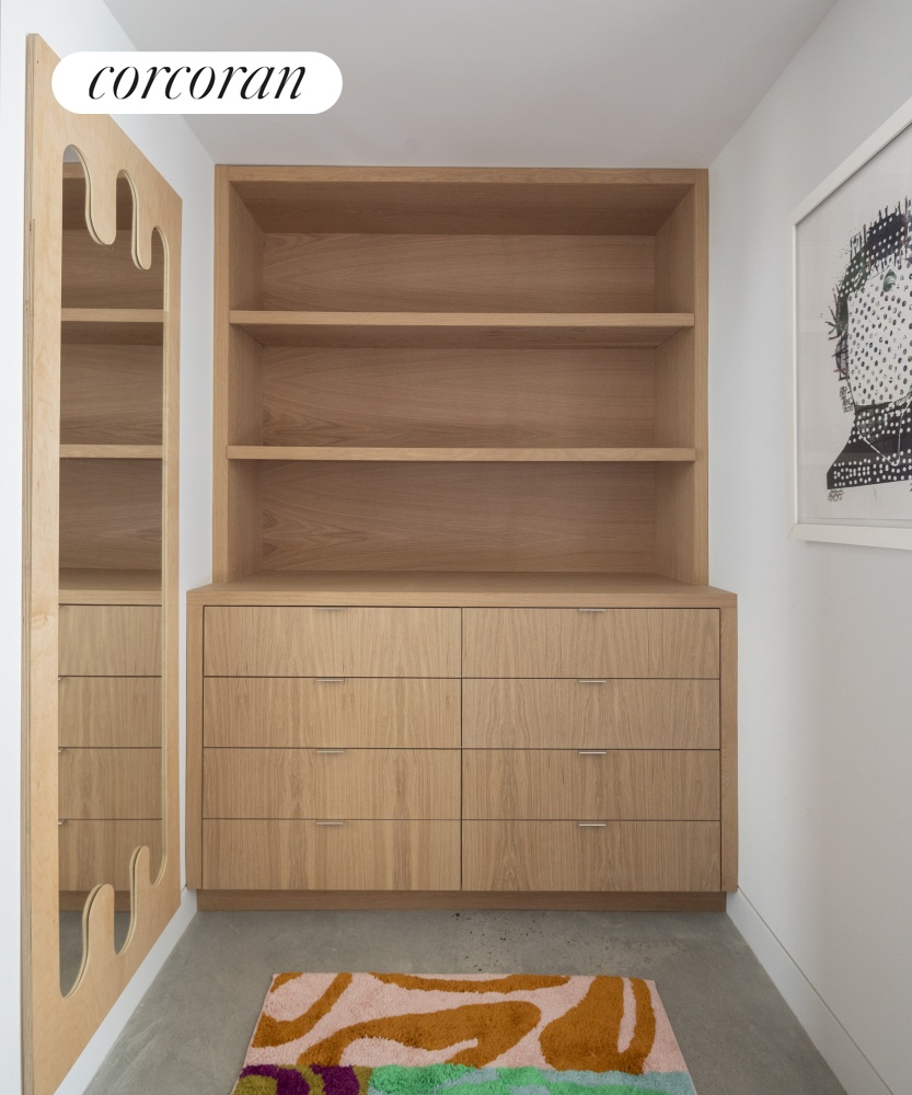 With its own private entrance beneath the stoop, the one-bedroom, 1.5-bath rental is equally impressive. The king-size bedroom includes a custom dressing room with built-in closets and drawers, leading to a luxurious bathroom with a long marble vanity and walk-in shower. A hallway with a powder room and Miele laundry closet leads to a peaceful great room where natural textures - polished concrete, warm wood cabinetry, and light green quartz - create an atmosphere of understated luxury. The rear wall opens to the garden through another Yawal glass wall, inviting the outdoors in.