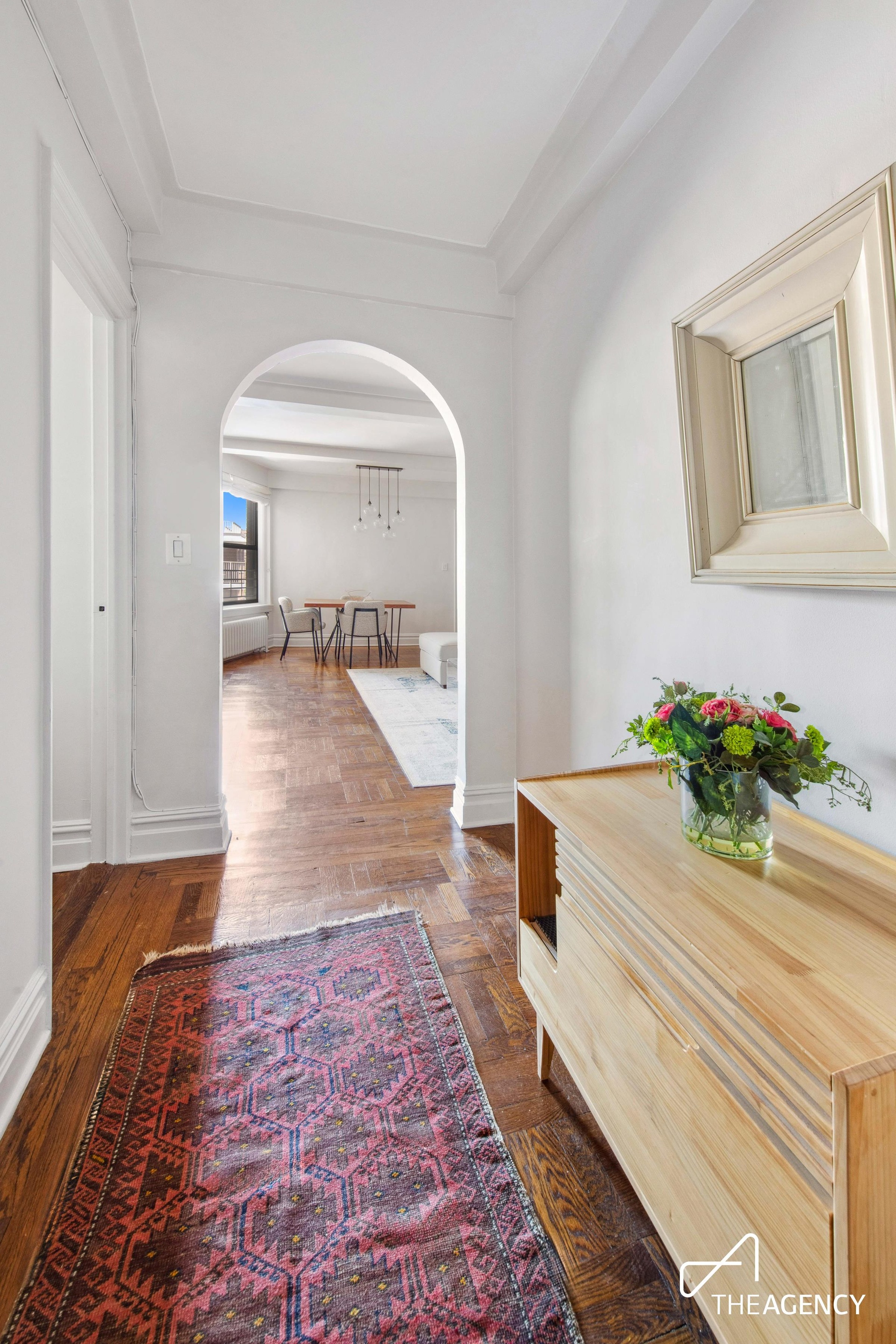 This spacious, proper 2-bedroom, 2-bathroom home is filled with natural light from multiple exposures and showcases classic pre-war details throughout — including high-beamed ceilings, archways, and refined moldings.