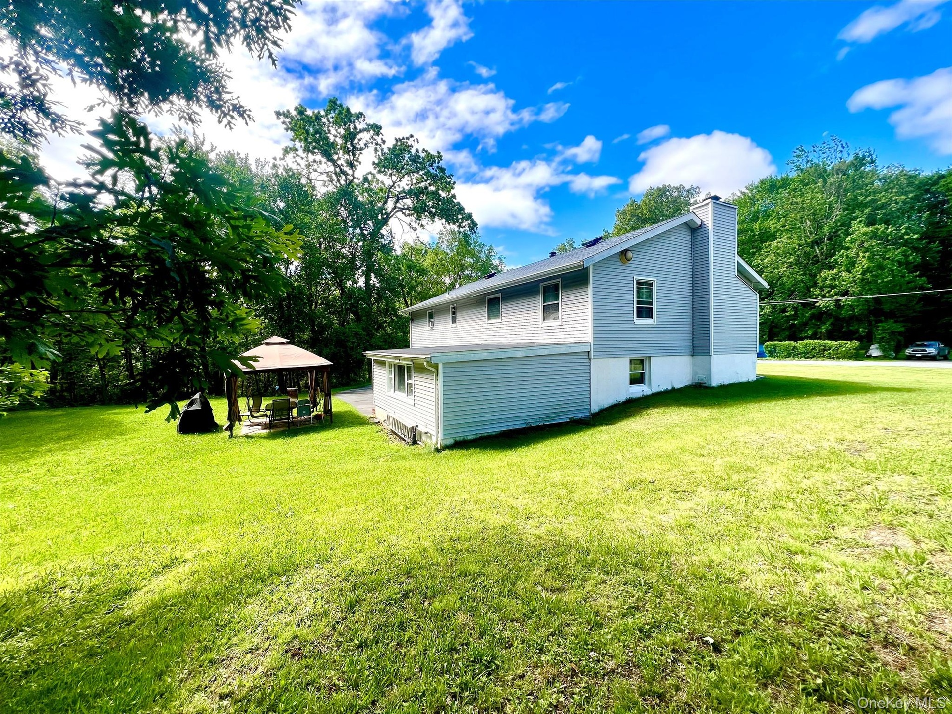 - Rear view of property with a gazebo, a chimney, and a lawn